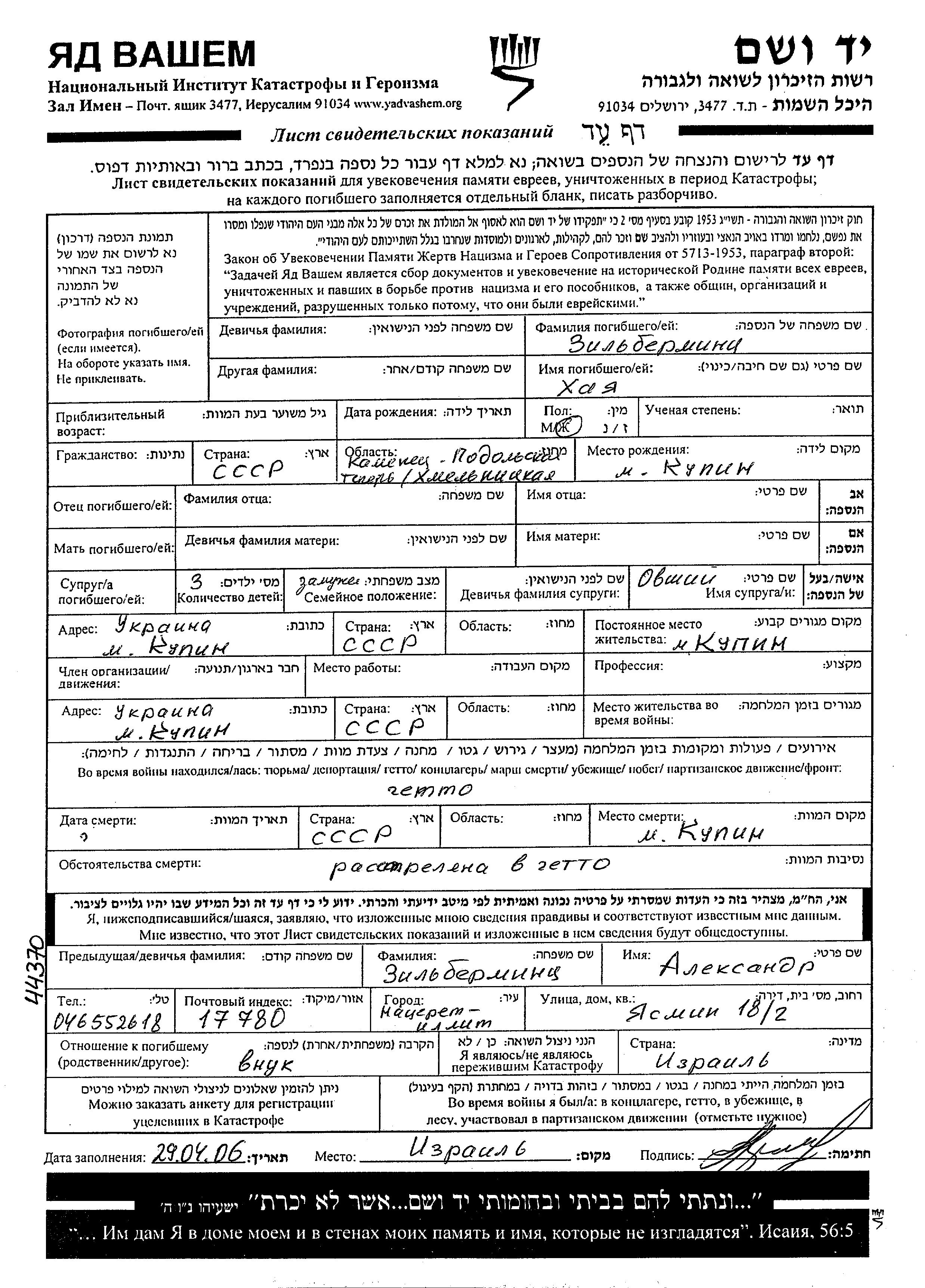 Zilbermintz Khaya Kupin, Ukraine (URSS) Feuille de témoignage