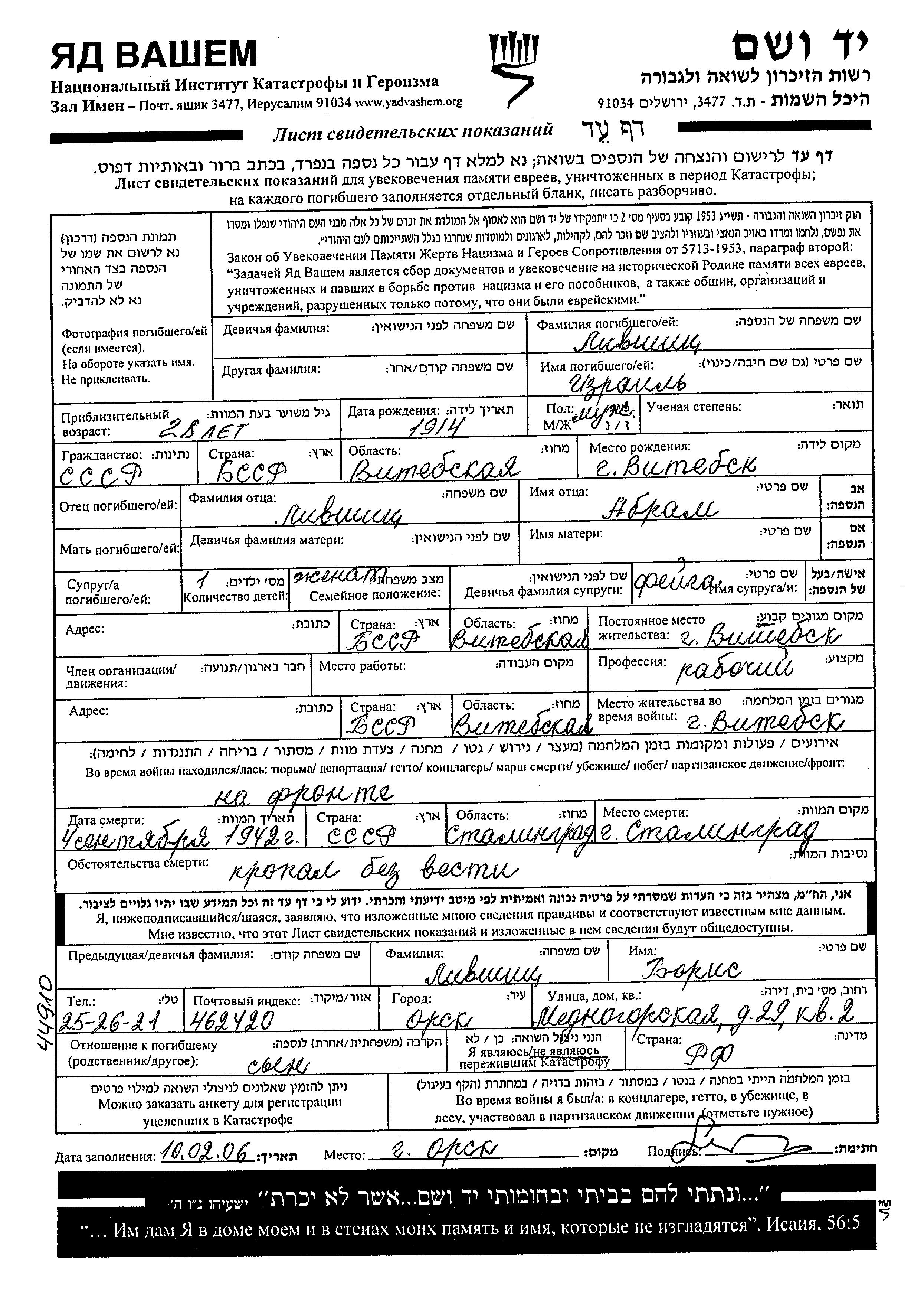 Livshitz Izrail 1914 Vitebsk, Bélorussie (URSS) Feuille de témoignage