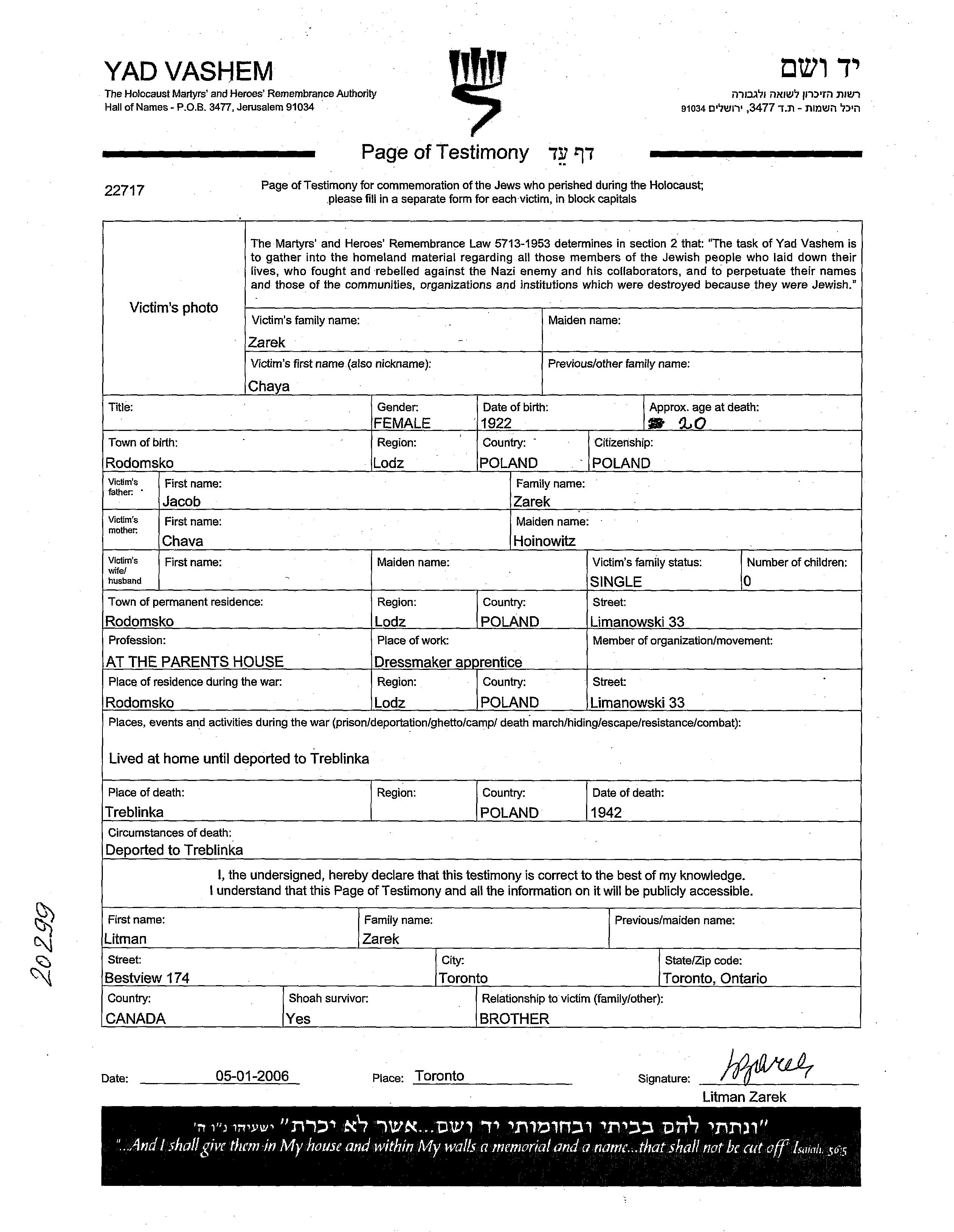 Zarek Chaya 1922 Radomsko, Pologne Feuille de témoignage (digitale-signée)