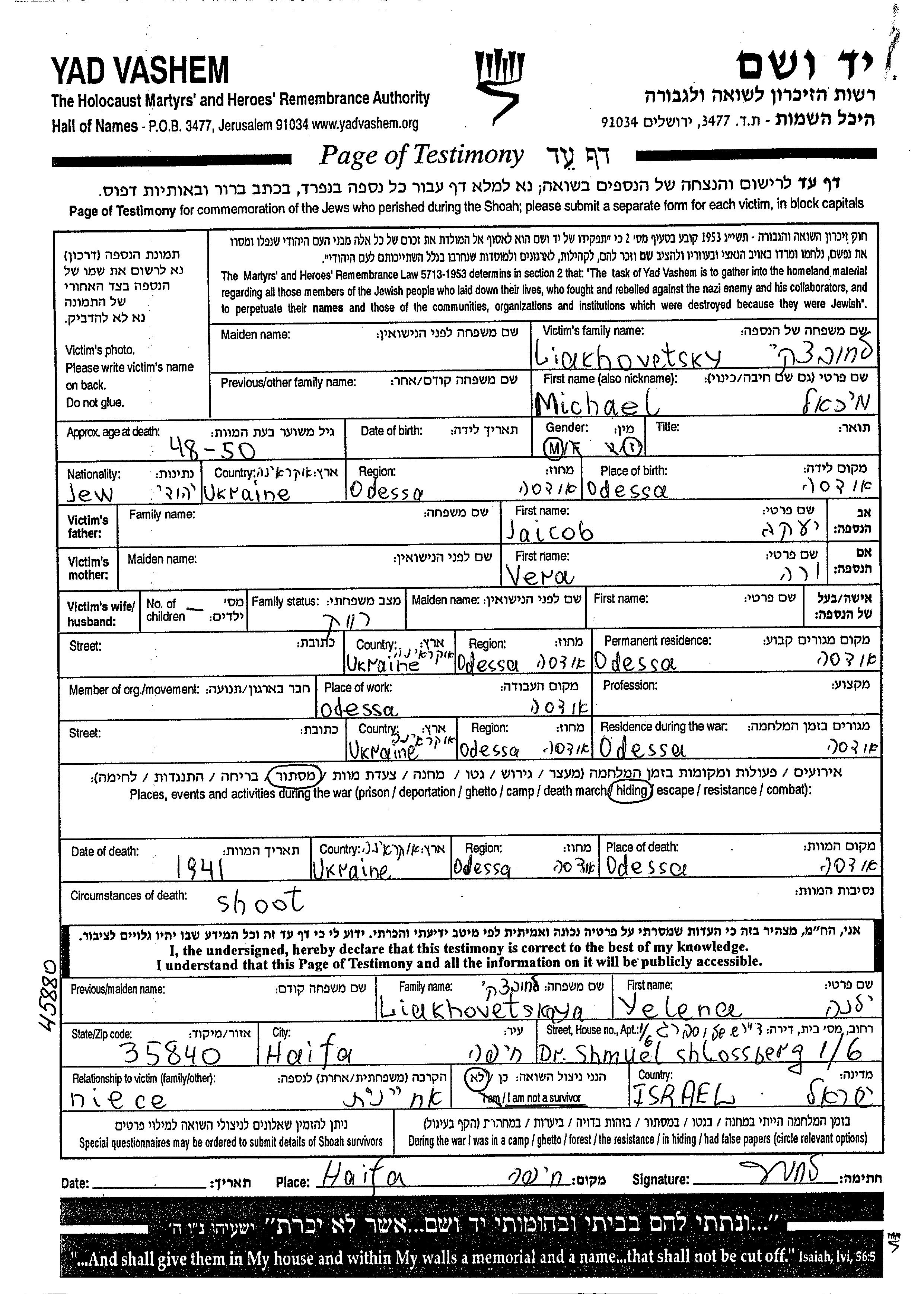 Michael a été assassiné pendant la Shoah. Lieu de la mort: Odessa, Ukraine (URSS) en 1941.