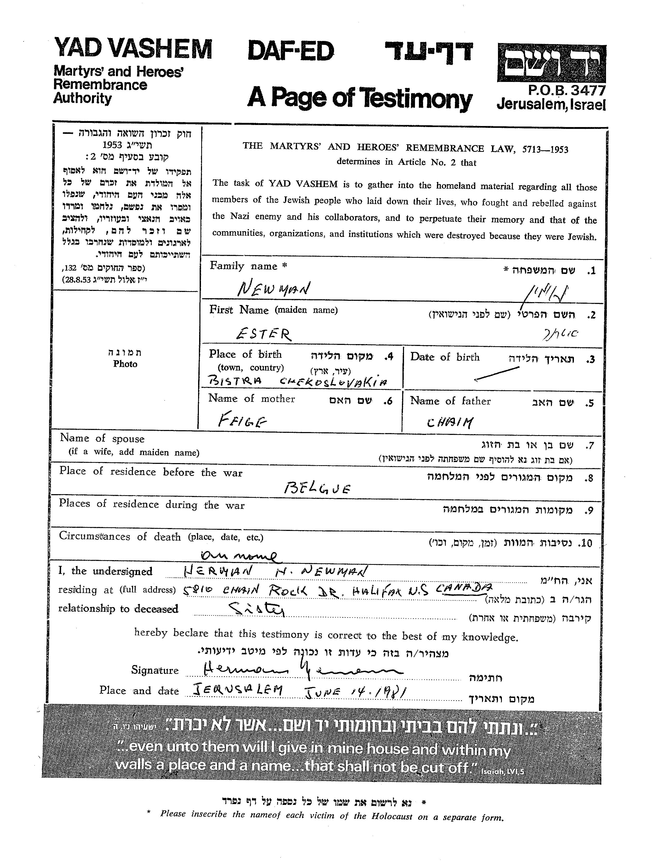 Ester Neuman est née à Bisztra, Tchécoslovaquie, fille de Chaim et de Feige. Avant la seconde guerre mondiale elle vivait à Belgique.