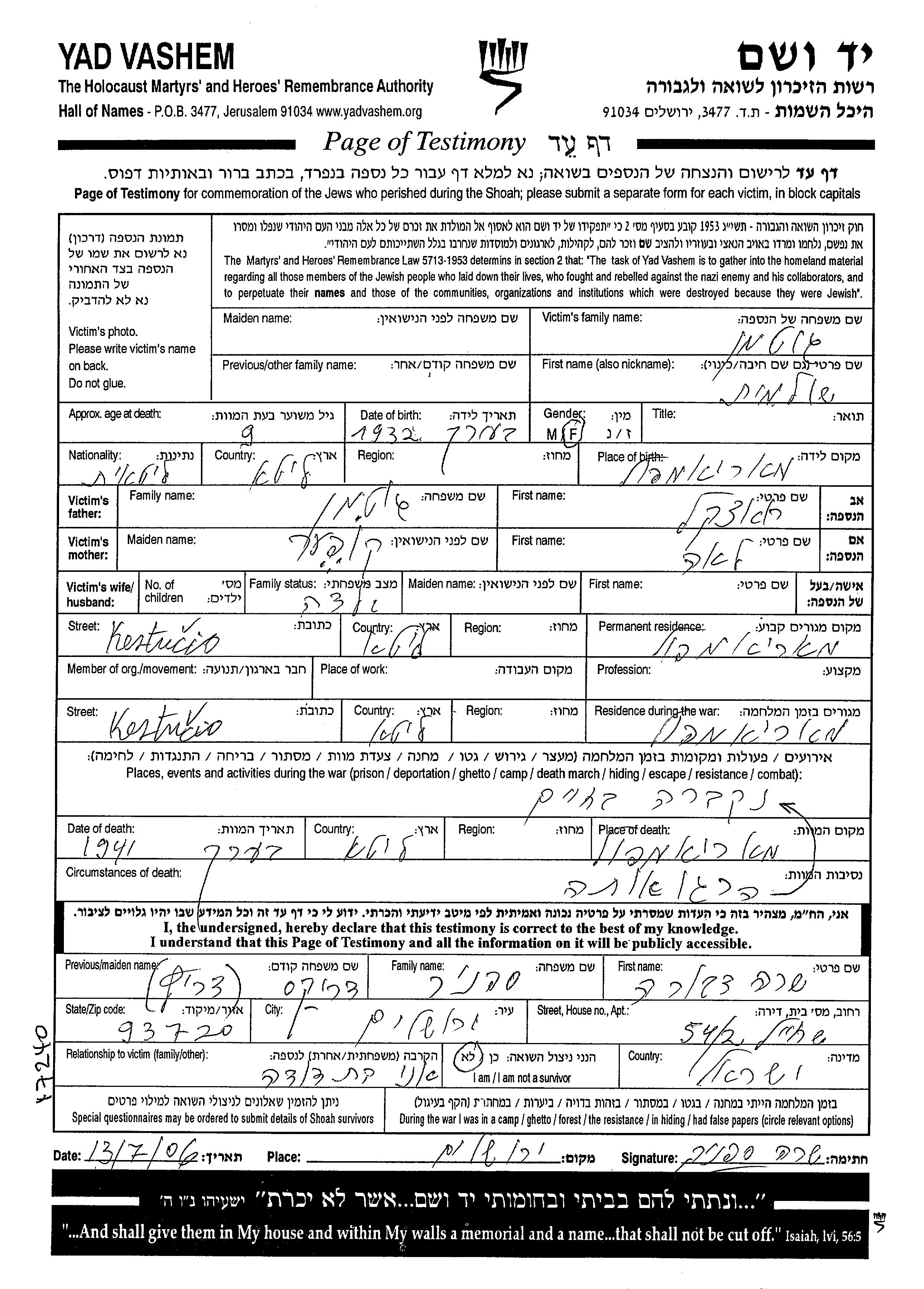 Yad Vashem - Pages of Testimony Names Memorial Collection