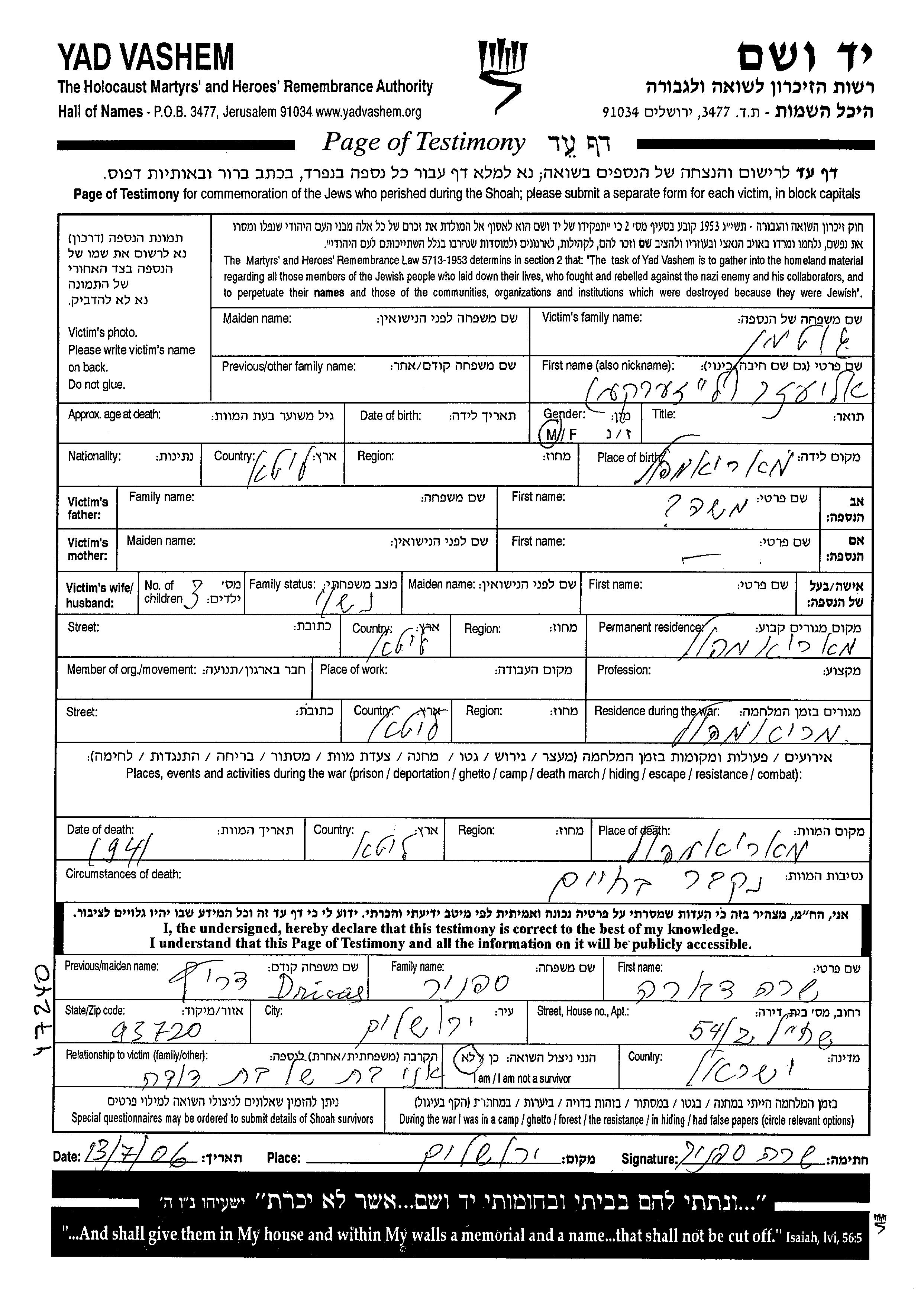 Yad Vashem - Pages of Testimony Names Memorial Collection