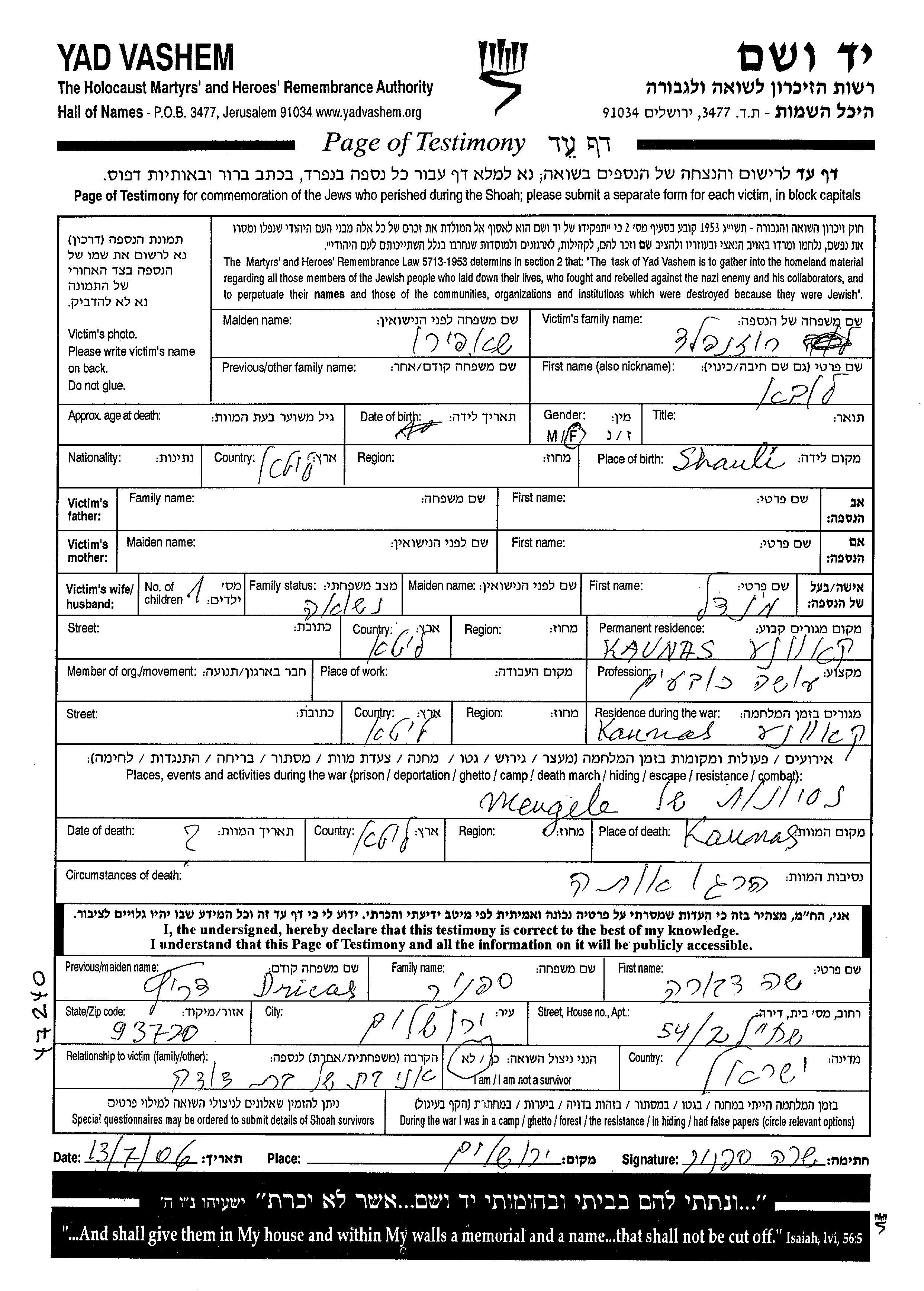 Yad Vashem - Pages of Testimony Names Memorial Collection