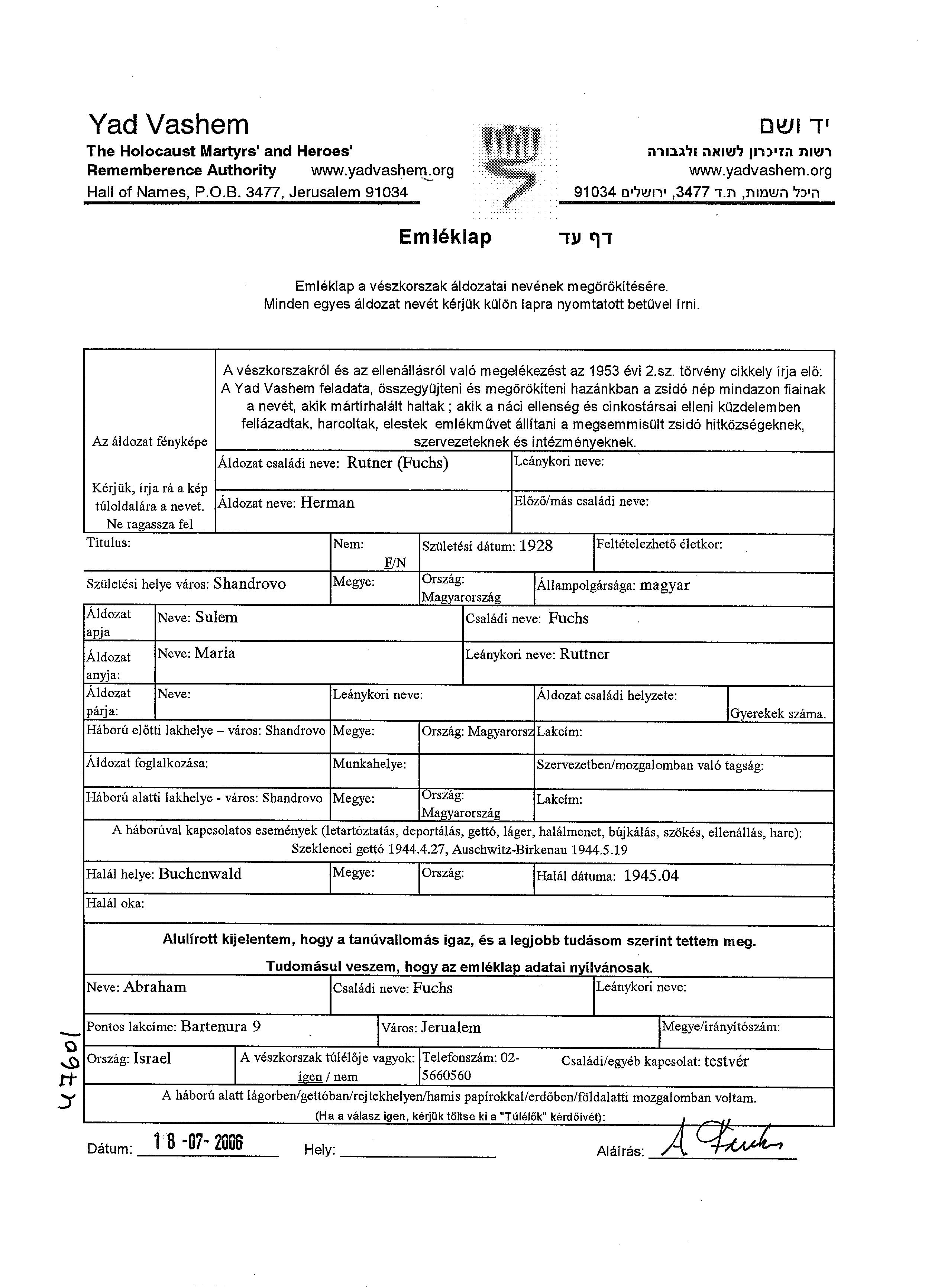 Fuchs Rutner Herman 1928 Sandrovo, Tchécoslovaquie Feuille de témoignage