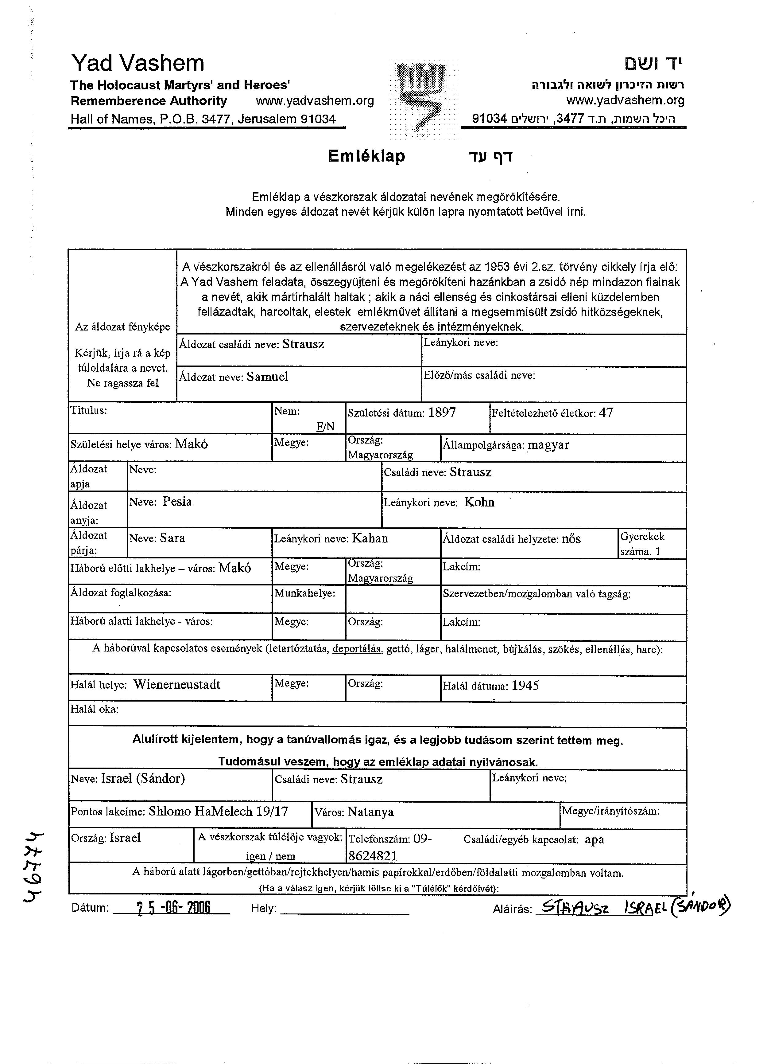 Samuel Strausz est né à Mako, Hongrie en 1897, fils de Pesia née Kohn. Il était Mariée à Sara née Kahan. Avant la seconde guerre mondiale il vivait à Mako, Hongrie.