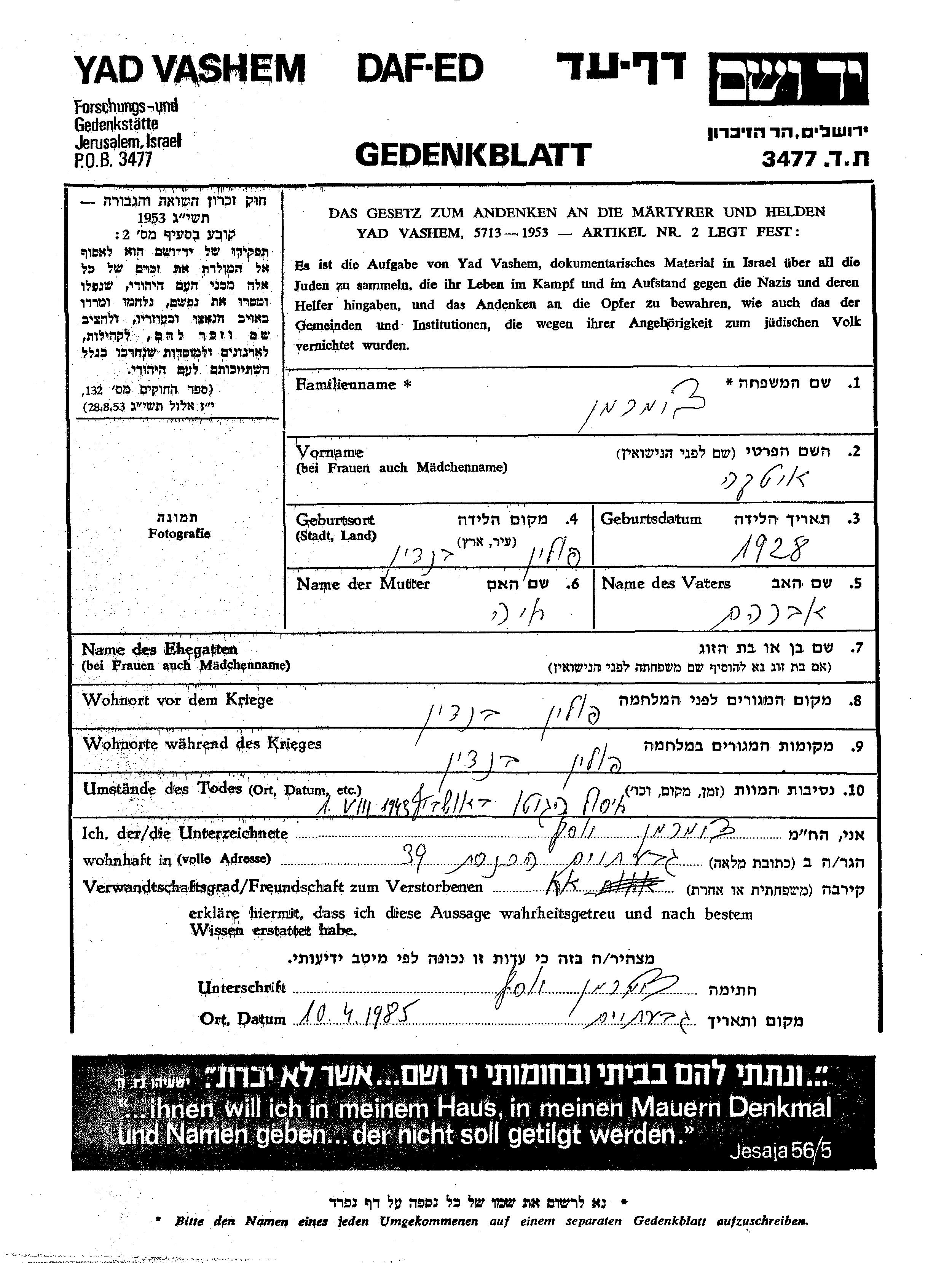 Yad Vashem - Pages of Testimony Names Memorial Collection