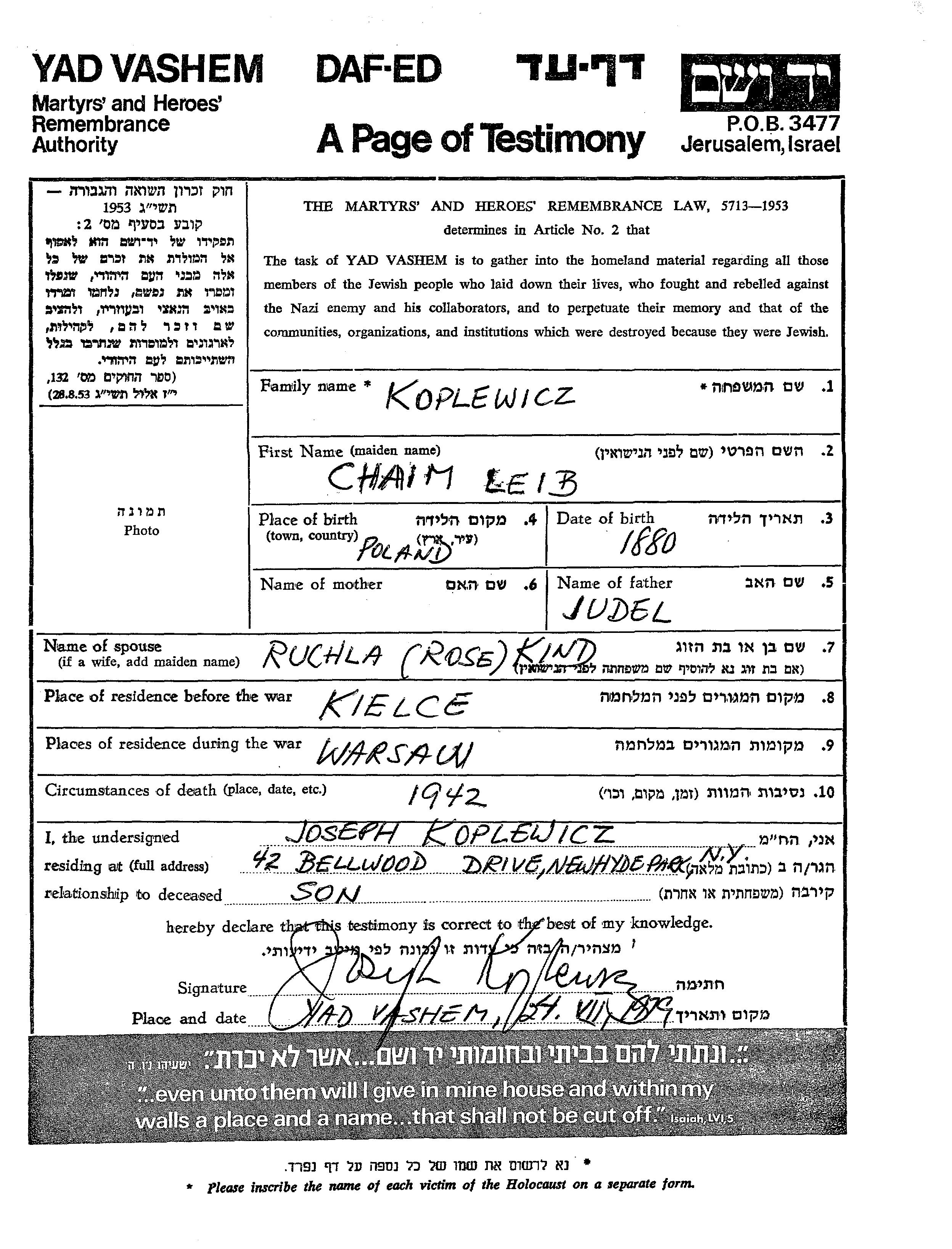 Chaim Leib Koplewicz est né à Pologne en 1880, fils de Judel. Avant la seconde guerre mondiale il vivait à Kielce, Pologne. Au cours de la guerre, il était à Warszawa, Pologne.