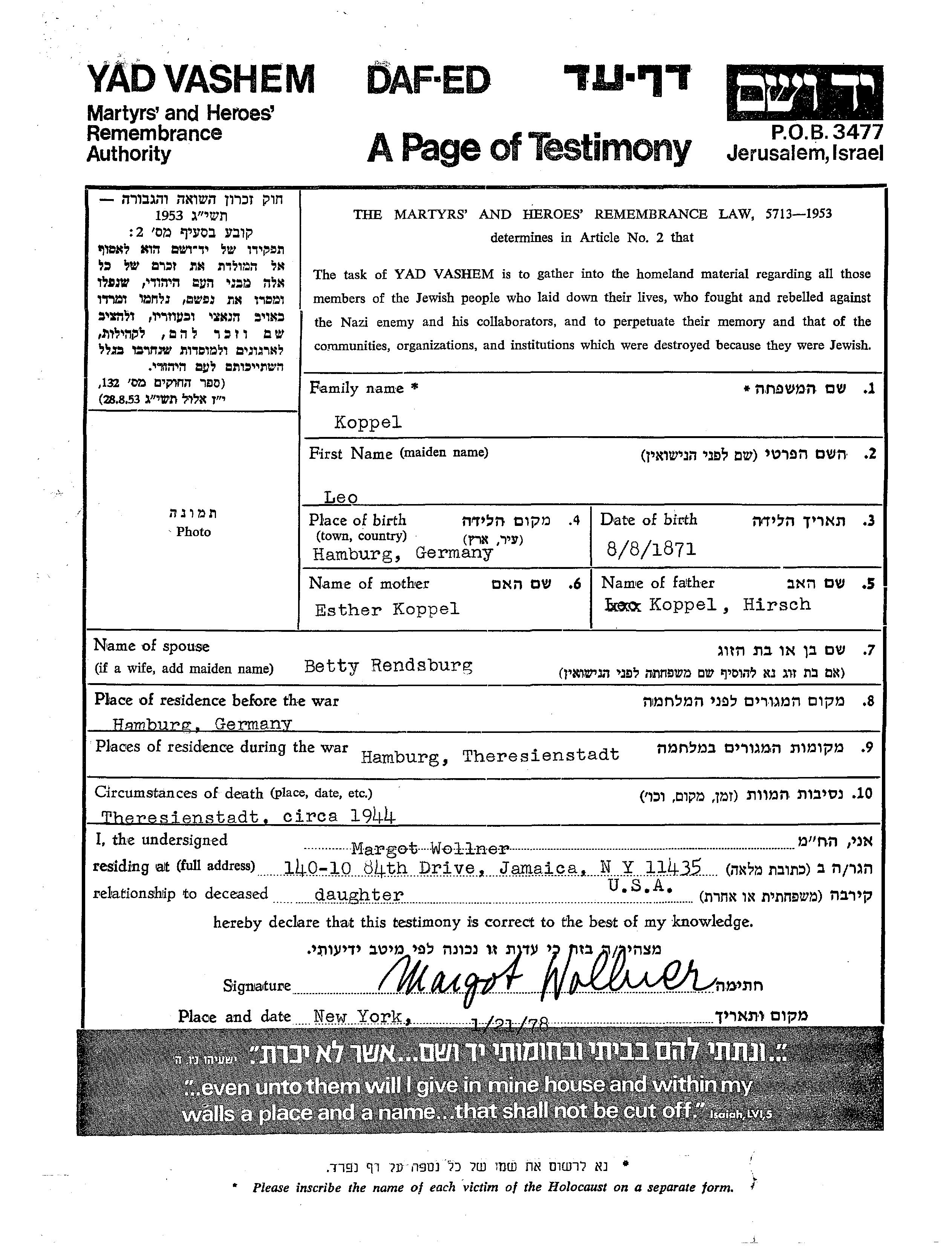 Leo Koppel est né à Hamburg, Allemagne en 1871, fils de Hirsch et de Esther. Avant la seconde guerre mondiale il vivait à Hamburg, Allemagne. Au cours de la guerre, il était à Theresienstadt, Tchécoslovaquie.