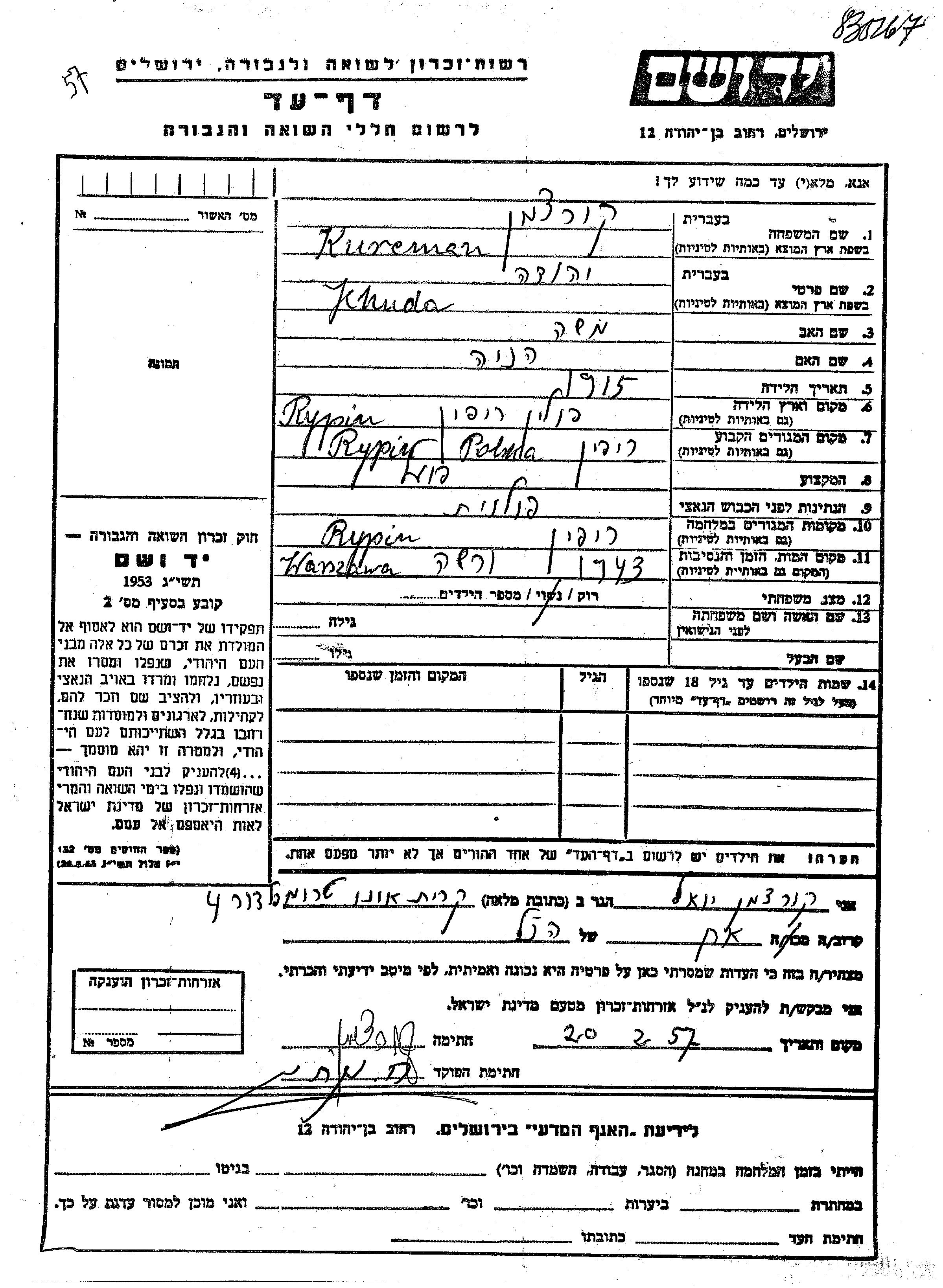 Kurcman Jehoda 1915 Rypin, Pologne Feuille de témoignage