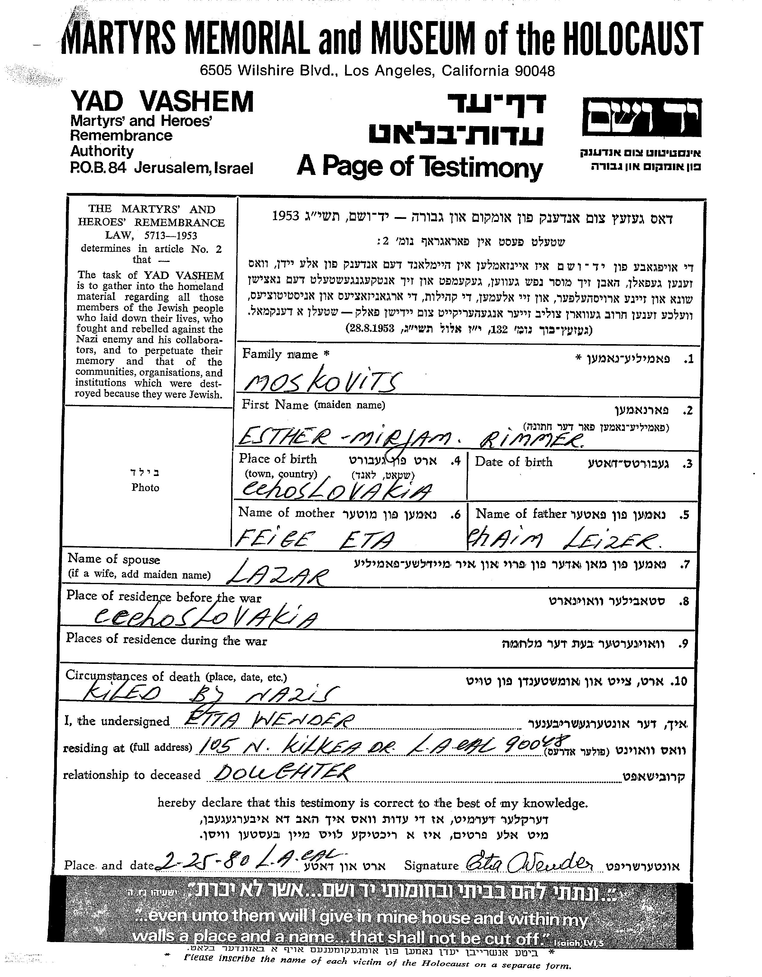 Moskovits Esther Mirjam Tchécoslovaquie Feuille de témoignage