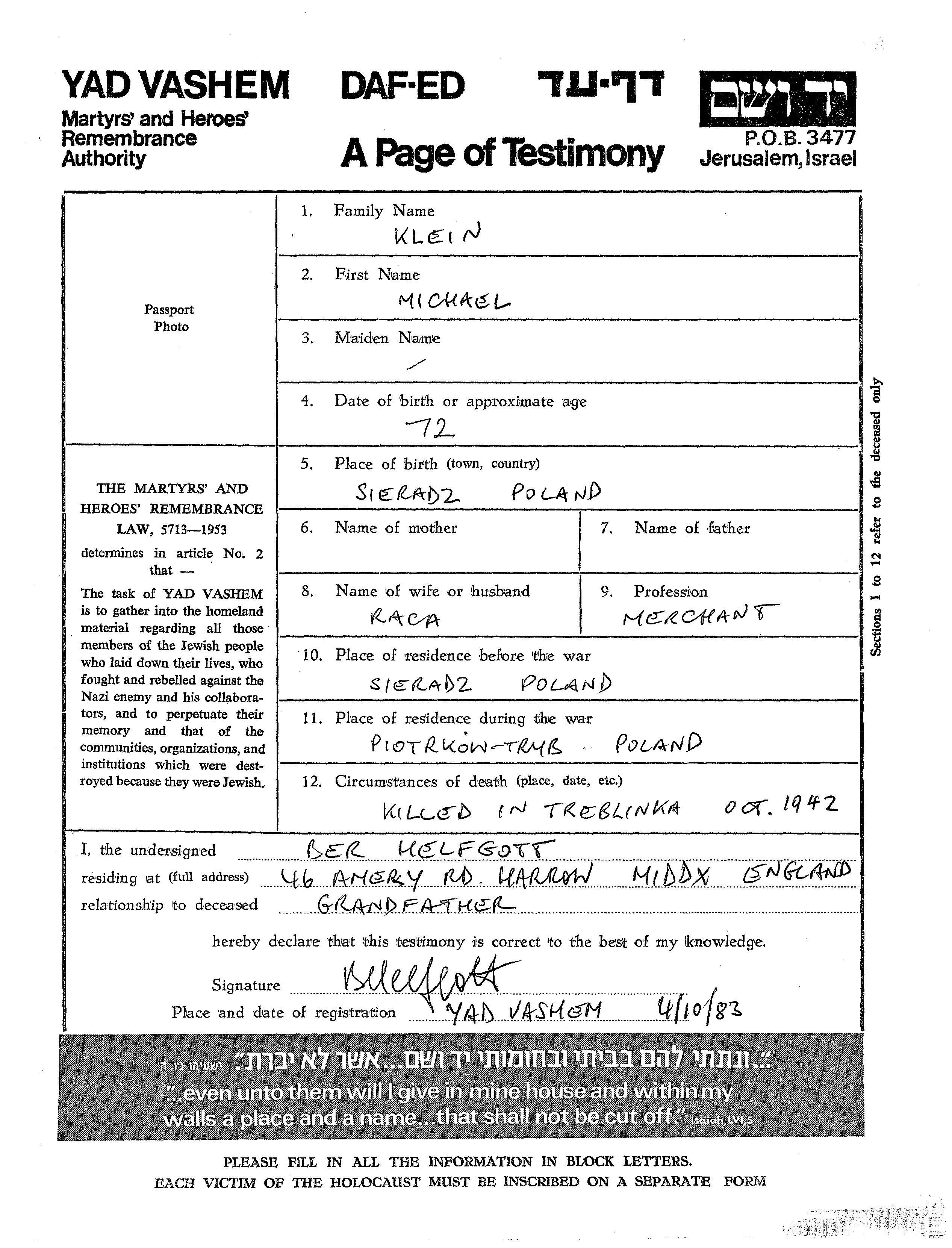 Klein Michael 1912 Sieradz, Pologne Feuille de témoignage