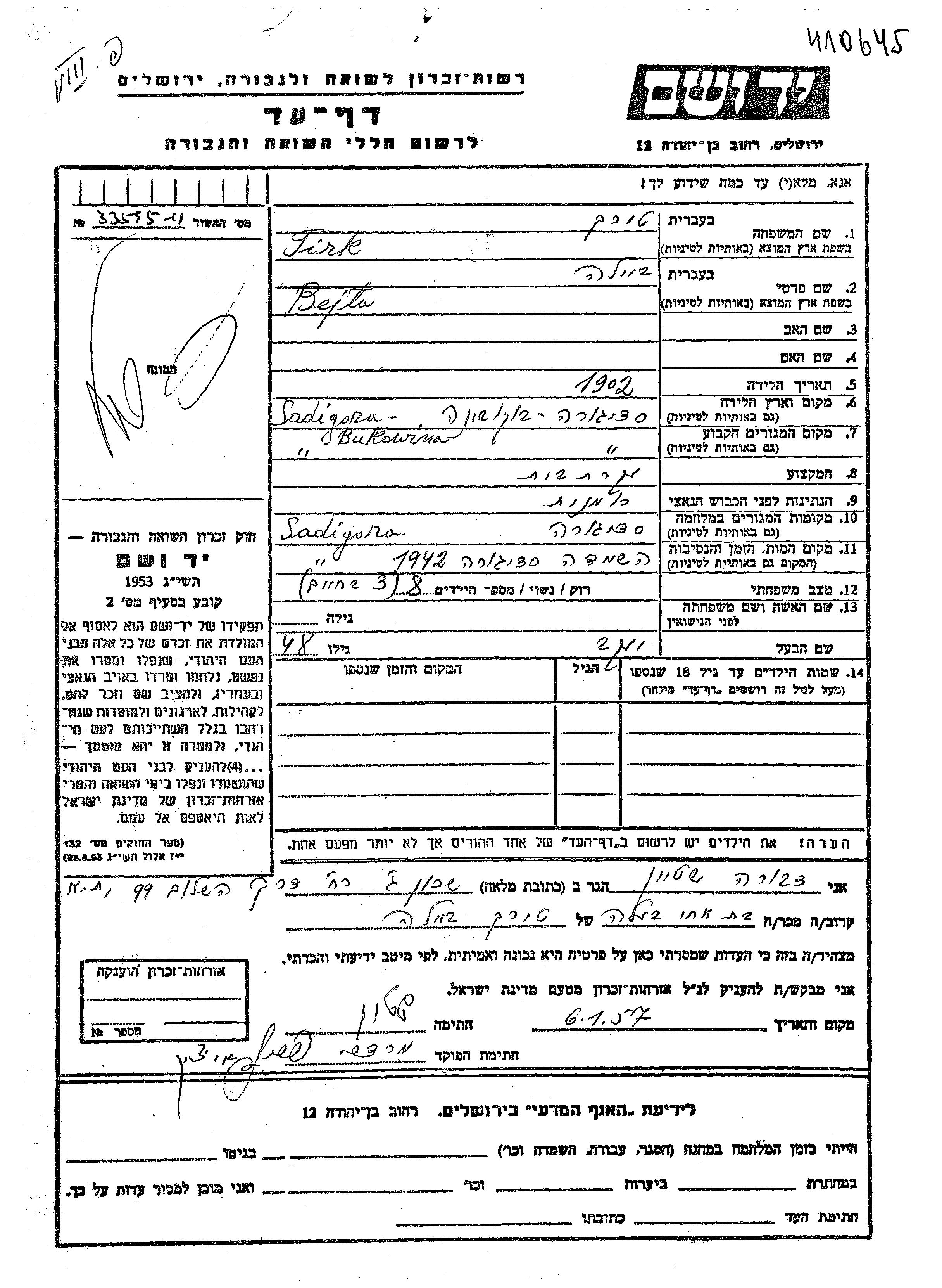 Bejla Tirk est née à Sadigora, Roumanie en 1902. Elle était Femme au foyer et Mariée à Yaakov. Avant la seconde guerre mondiale elle vivait à Sadigora, Roumanie. Pendant la guerre, elle était à Sadigora, Roumanie.