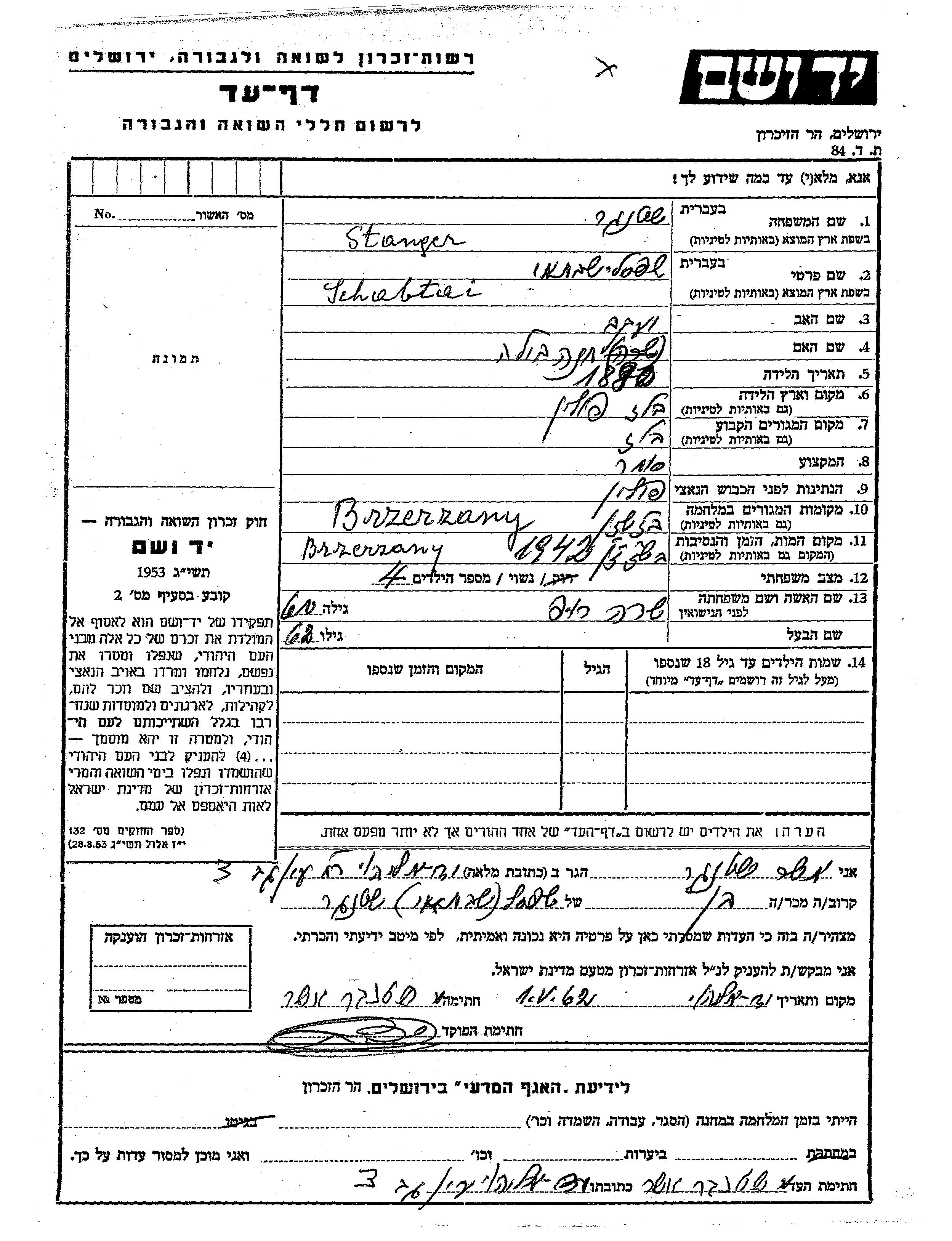 Stanger Schabtai 1890 Belz, Pologne Feuille de témoignage