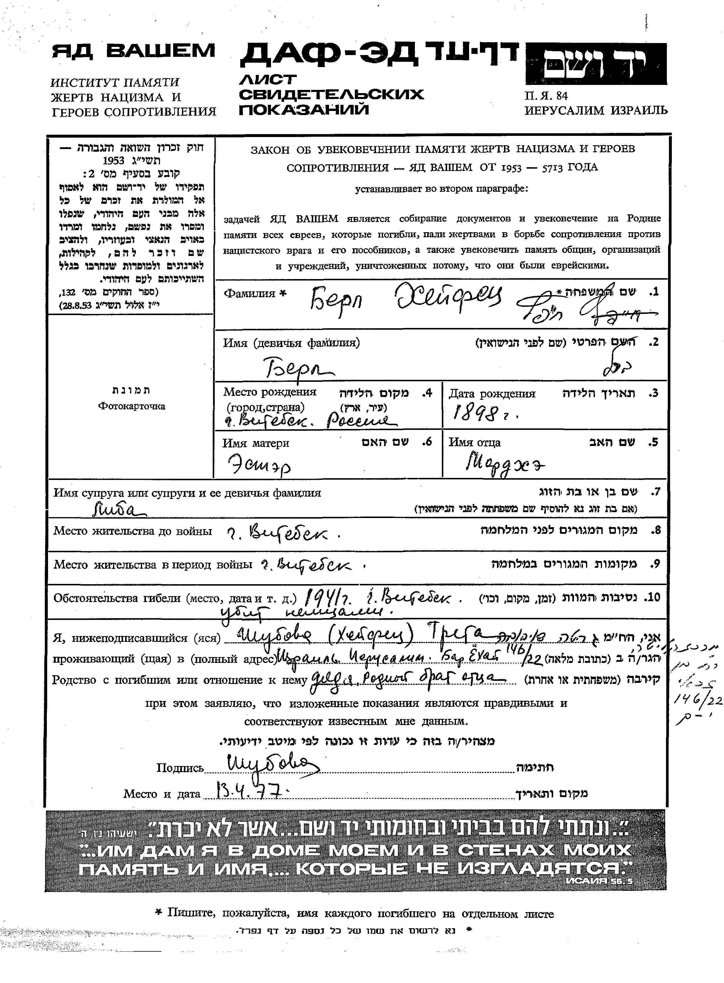 Kheifetz Berl 1898 Vitebsk, Bélorussie (URSS) Feuille de témoignage
