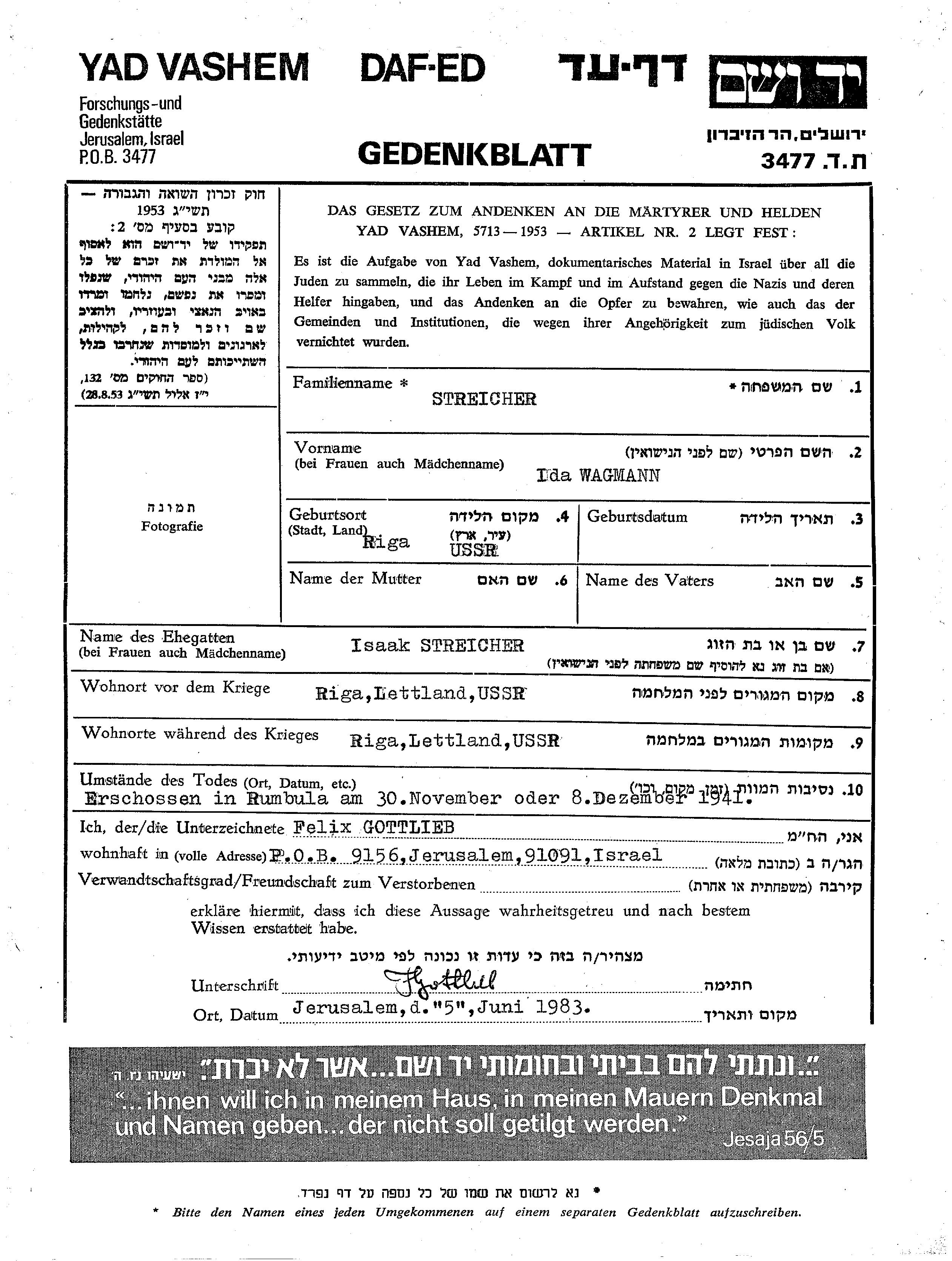 Streicher Ida Riga, Lettonie Feuille de témoignage