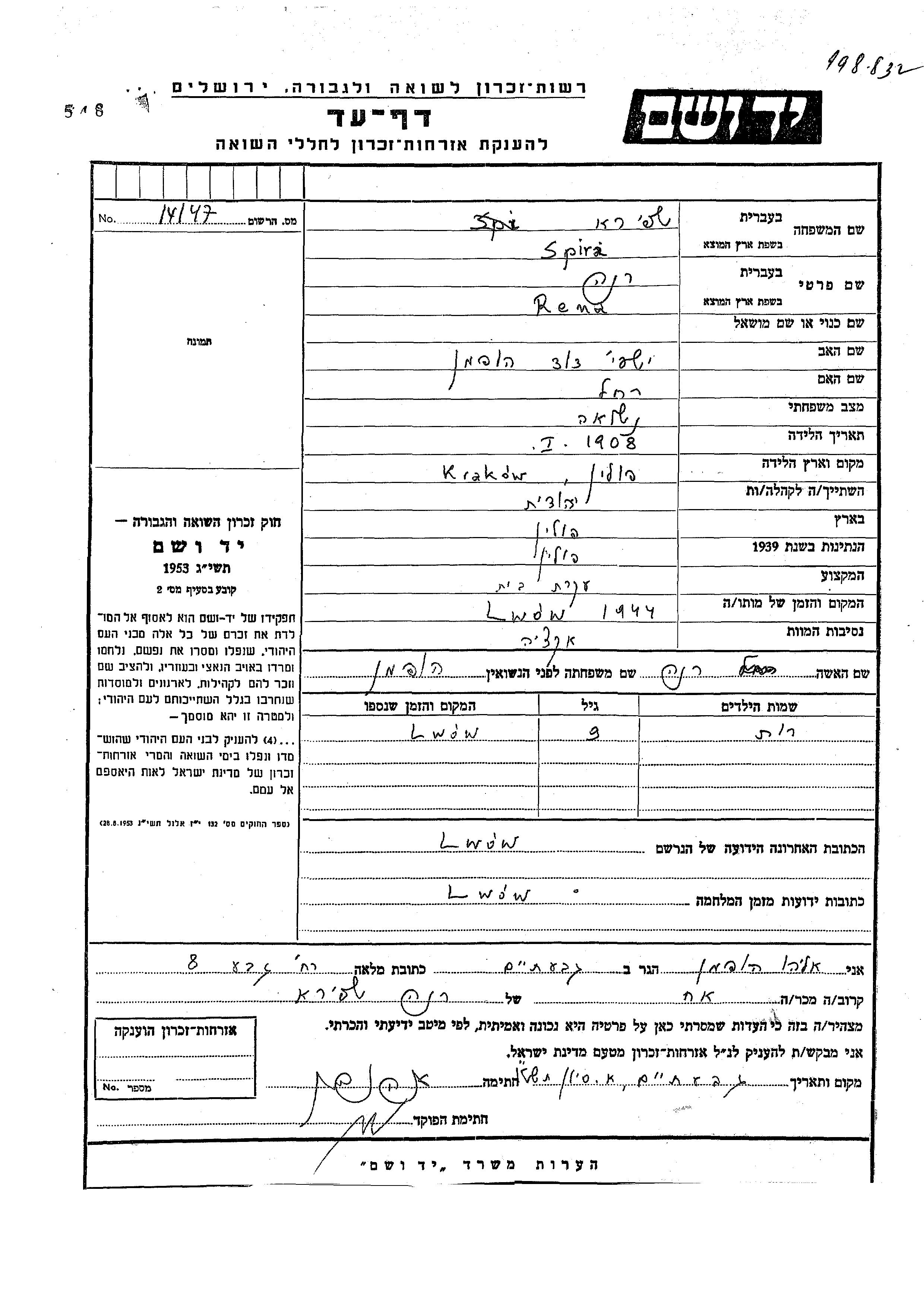 Spira Rena Rene 1908 Lwow, Pologne Feuille de témoignage