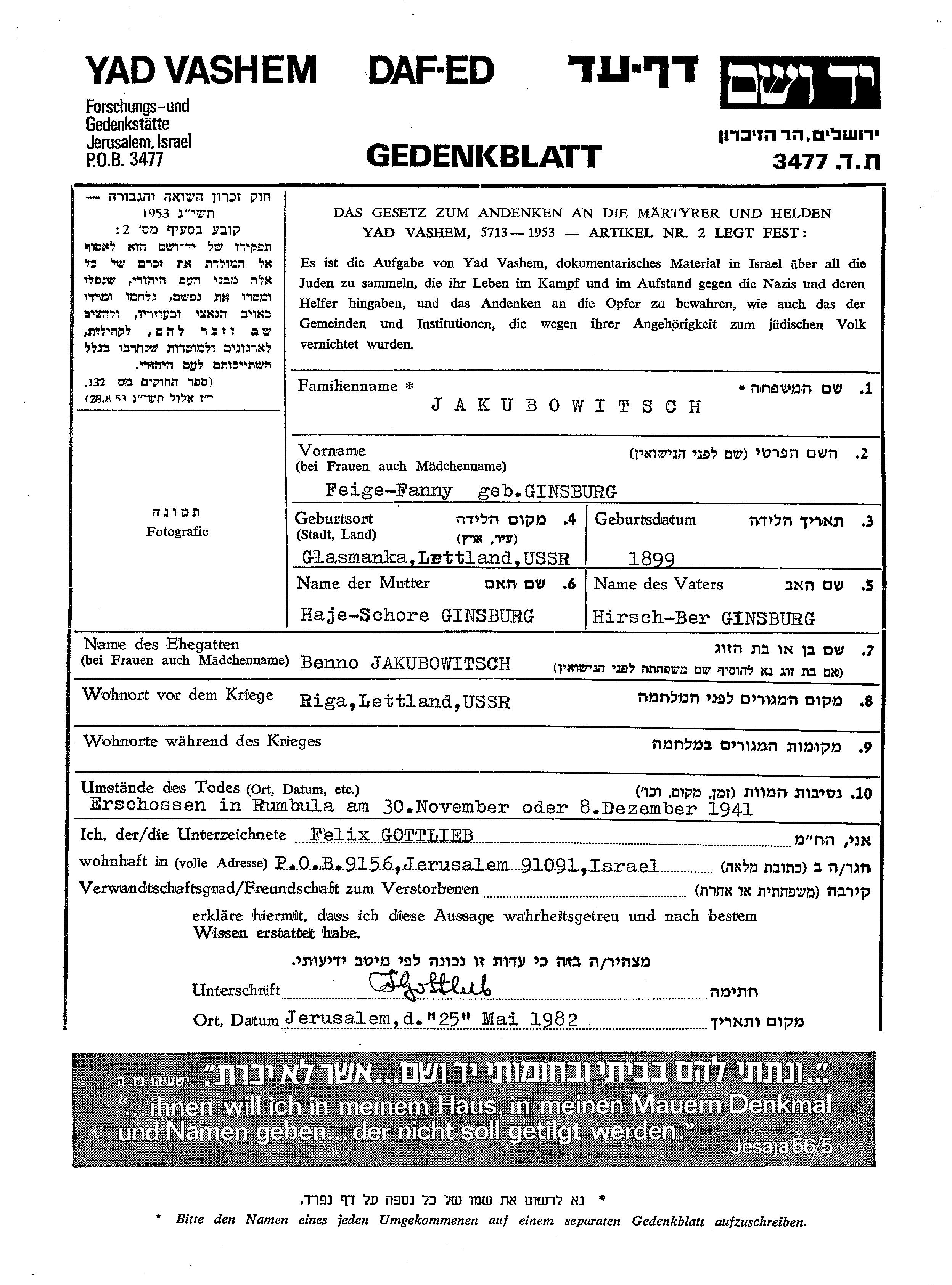 Jakubowitsch Feiga Fanny 1899 Riga, Lettonie Feuille de témoignage
