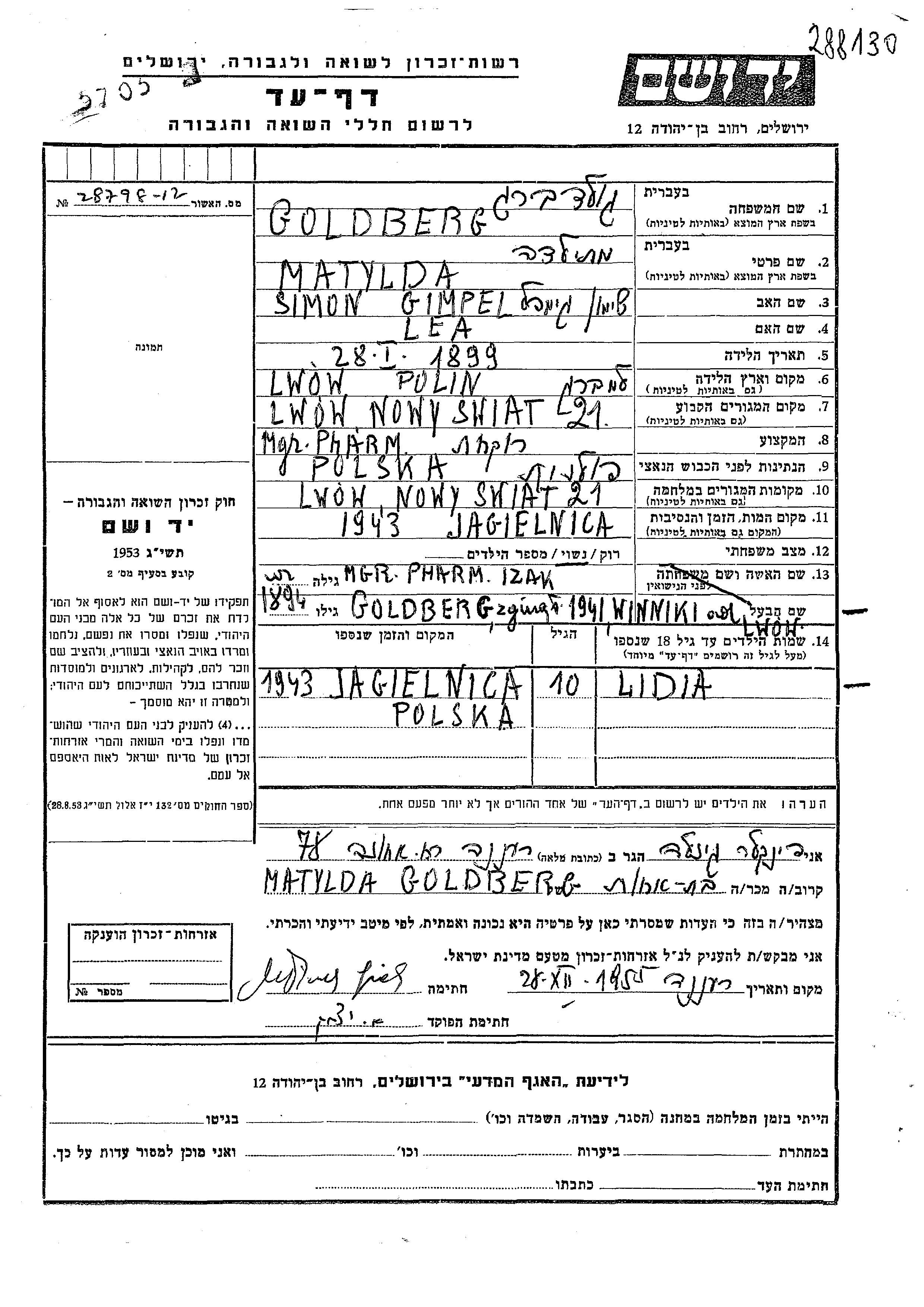 Goldberg Matylda 1899 Lwow, Pologne Feuille de témoignage