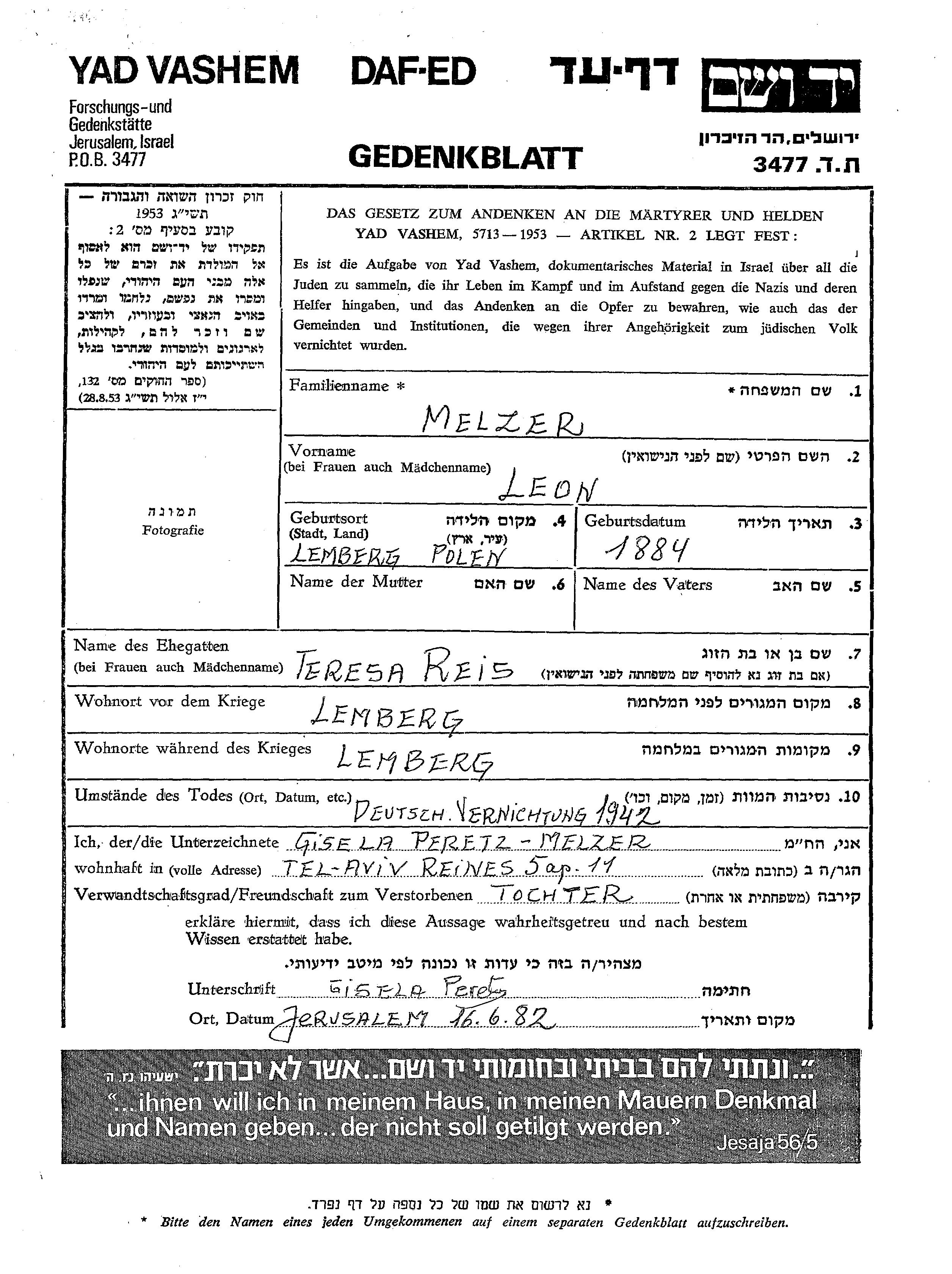Leon Melzer est né à Lemberg, Pologne en 1884. Avant la seconde guerre mondiale il vivait à Lemberg, Pologne. Au cours de la guerre, il était à Lemberg, Pologne.