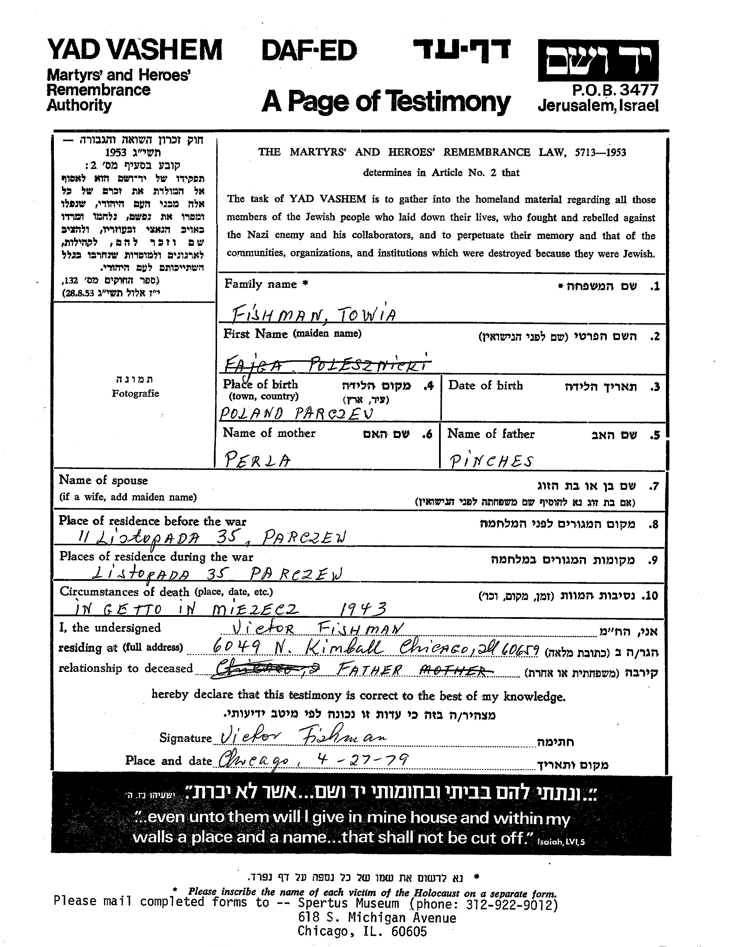 Fishman Towia Parczew, Pologne Feuille de témoignage