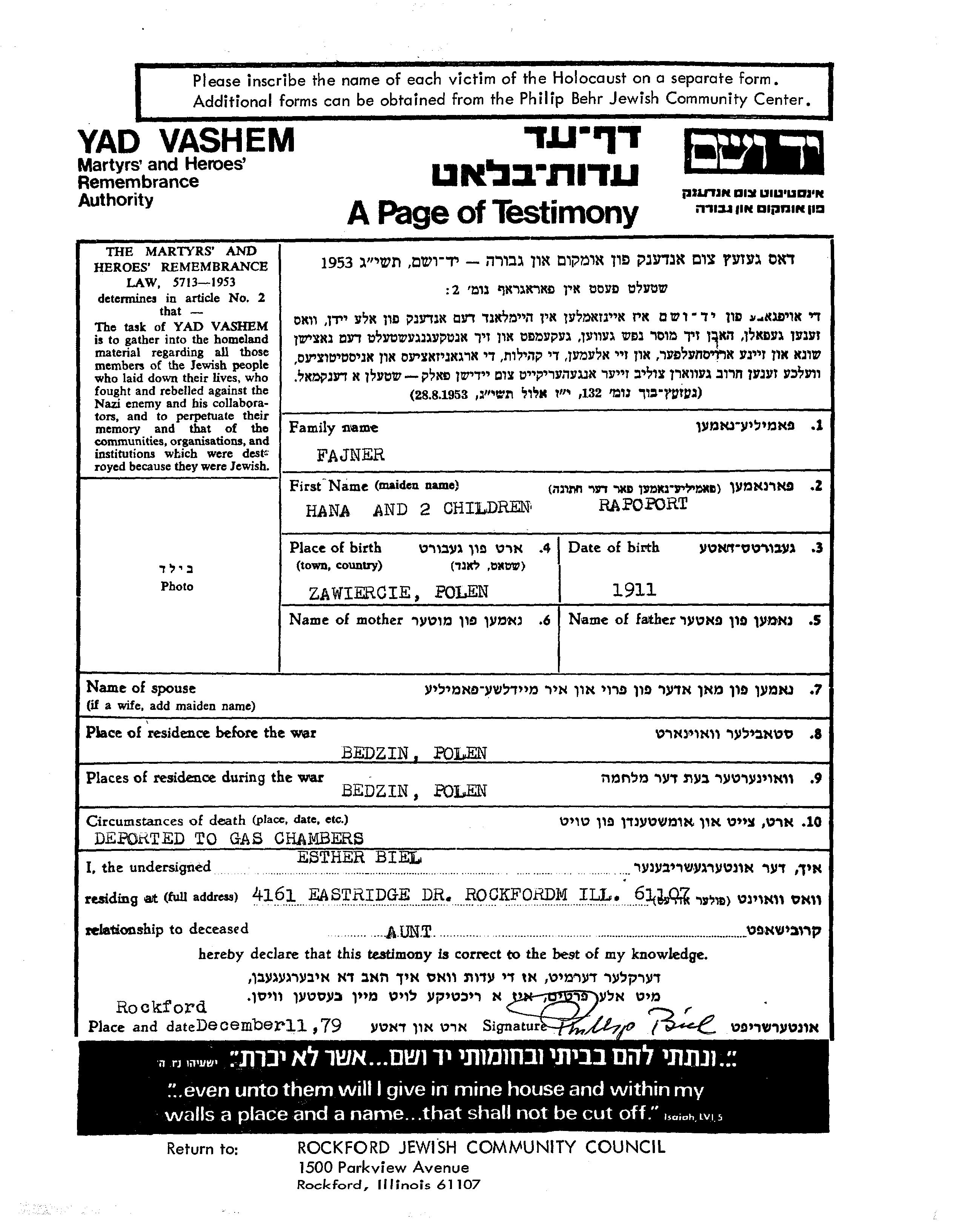 Fajner Hana 1911 Będzin, Pologne Feuille de témoignage