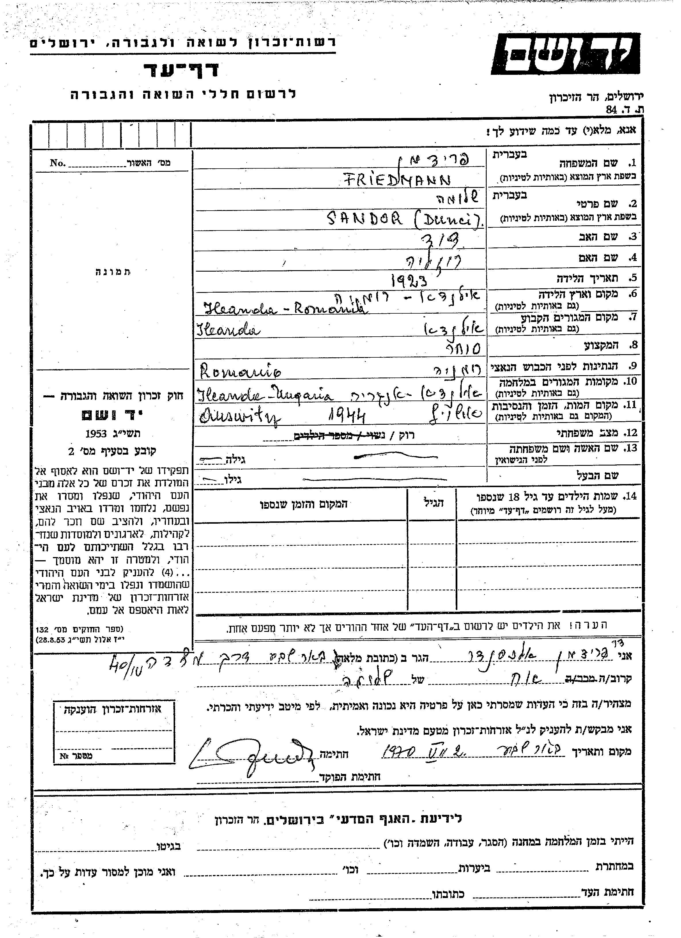 Friedman Sandor Shlomo 1923 Ileanda, Roumanie Feuille de témoignage
