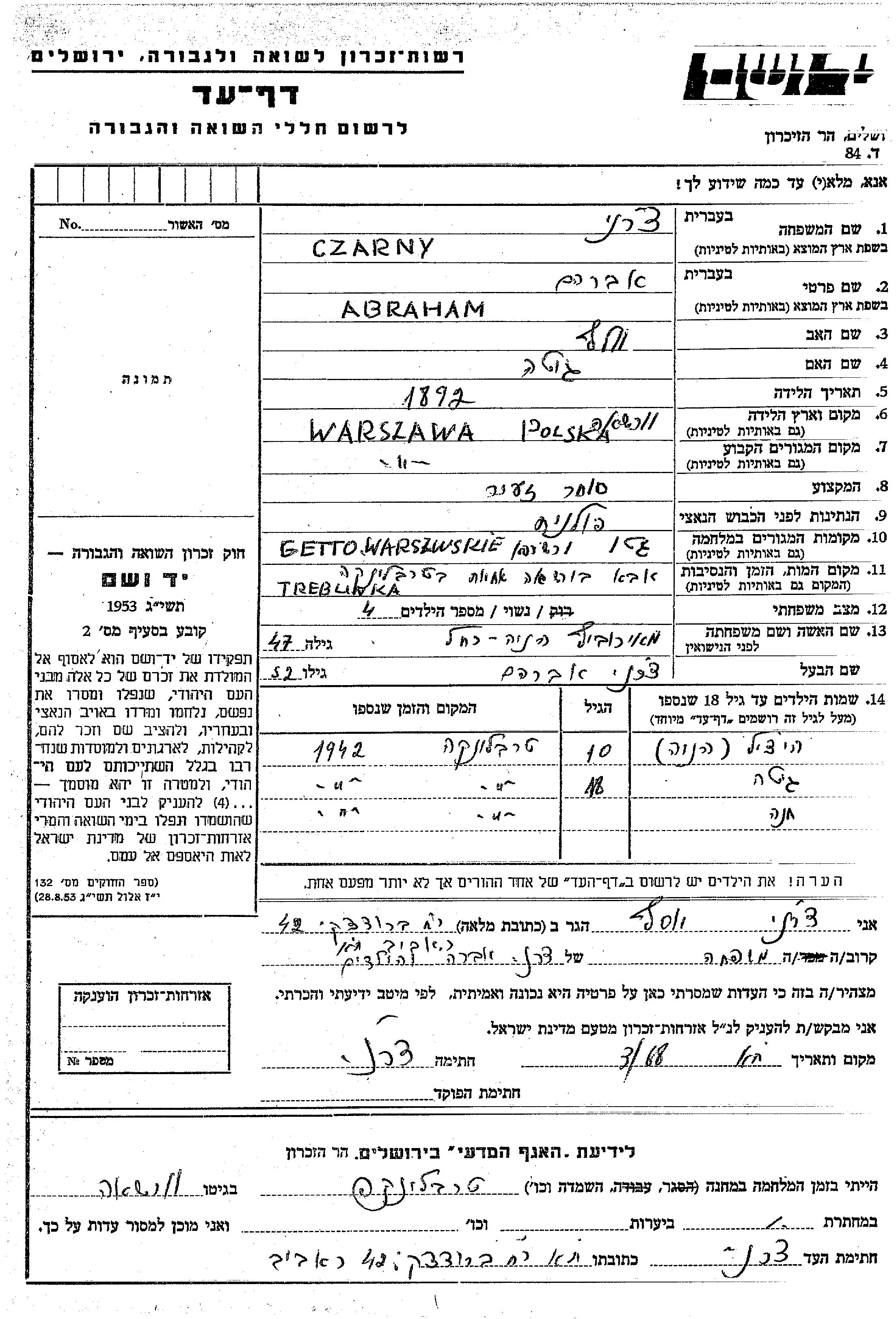 Abraham Czarny est né à Warsaw, Pologne en 1892, fils de Volf et de Gita. Il était Commerçant/e et Mariée à Henia Rakhel née Meirovitz. Avant la seconde guerre mondiale il vivait à Warsaw, Pologne. Au cours de la guerre, il était à Warszawa, Pologne.