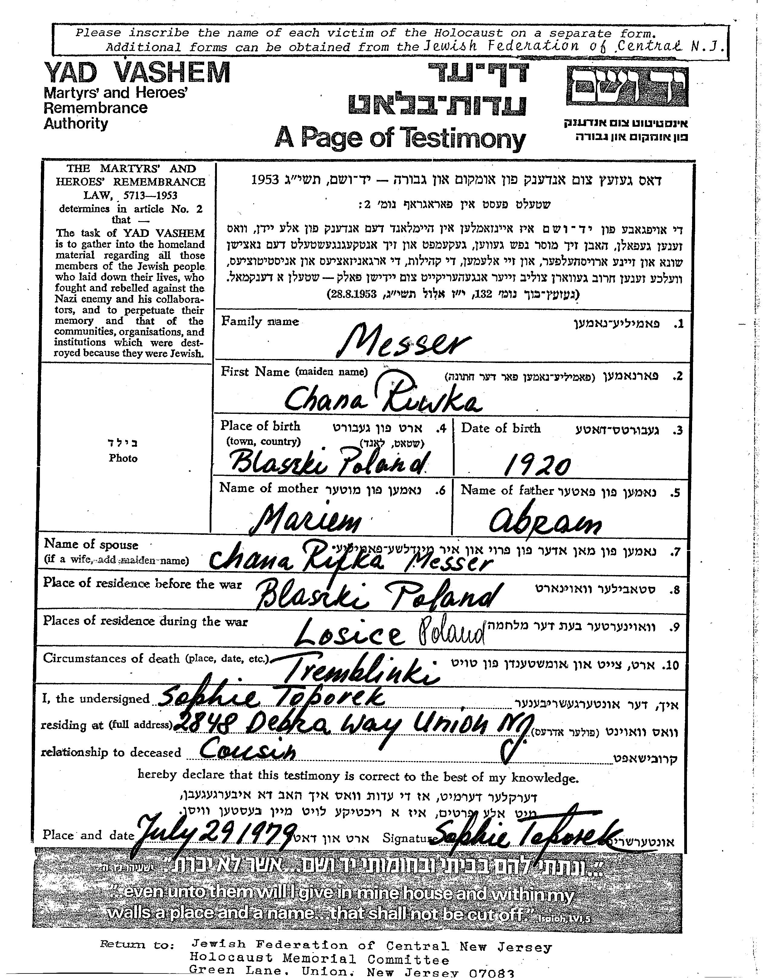 Chana Riwka nom inconnu née Messer est née à Blaszki, Pologne en 1920, fille de Abram et de Mariem. Elle était Mariée. Avant la seconde guerre mondiale elle vivait à Blaszki, Pologne. Pendant la guerre, elle était à Losice, Pologne.
