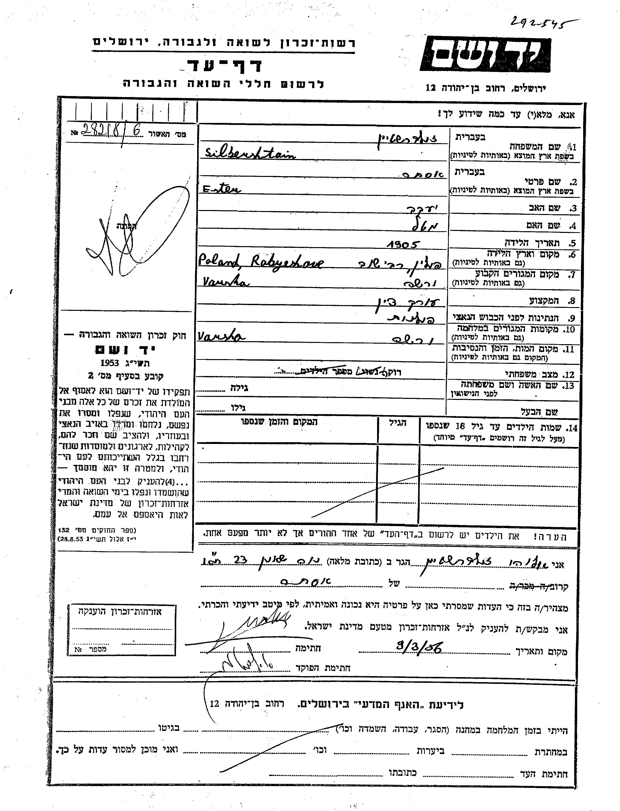 Silbershtain Ester 1905 Warsaw, Pologne Feuille de témoignage