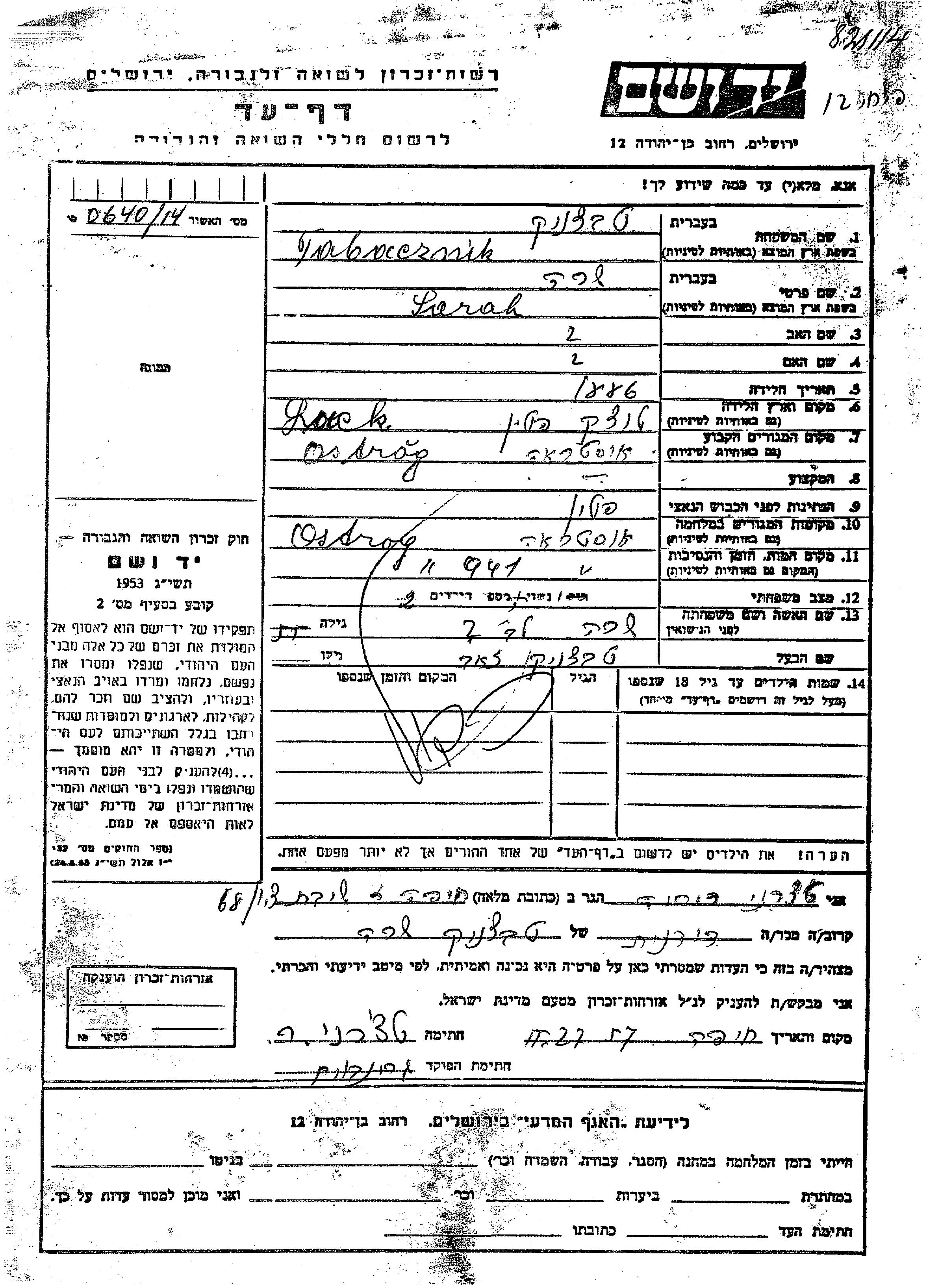 Yad Vashem - Pages of Testimony Names Memorial Collection