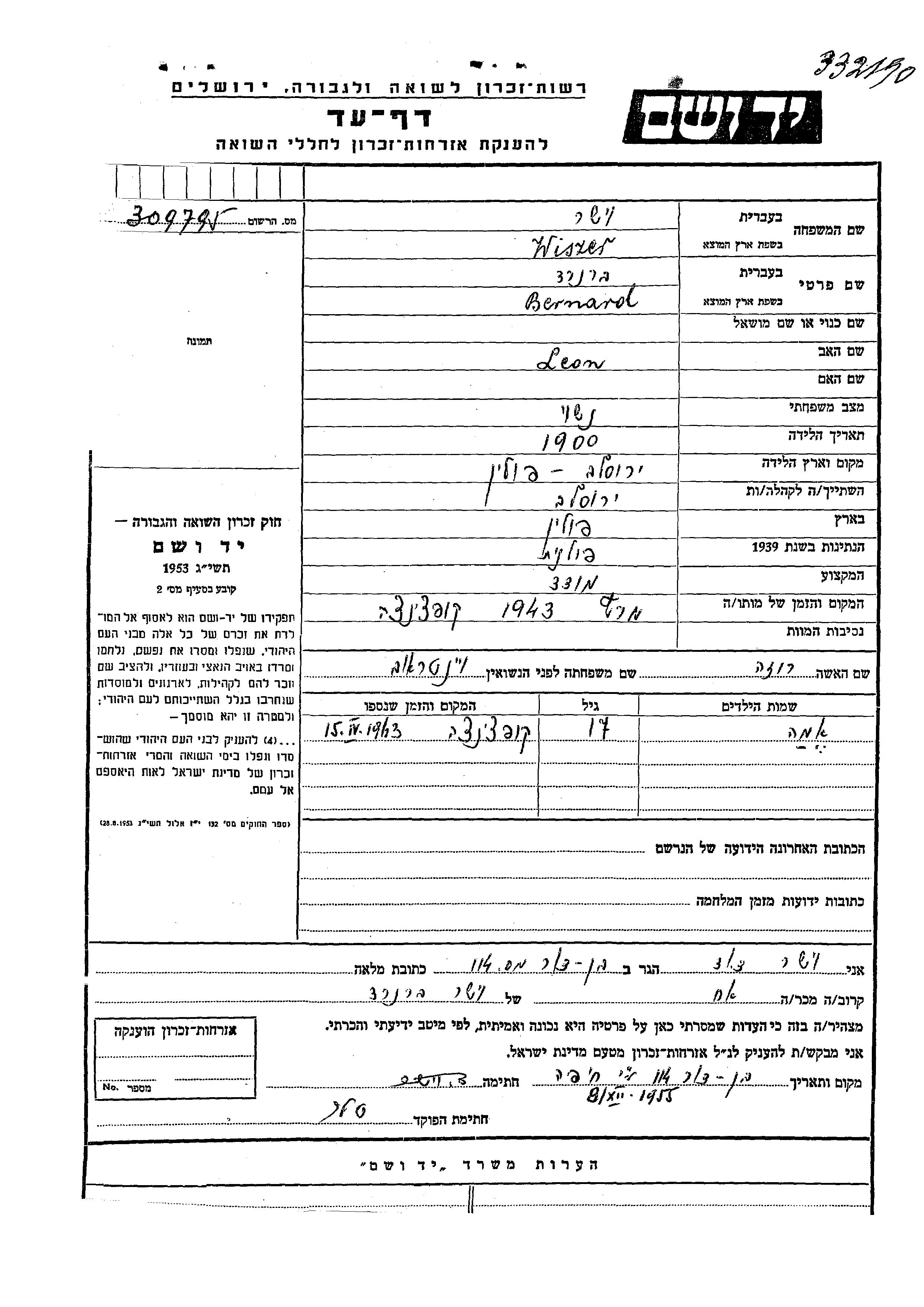 Wiszer Bernard 1900 Jaroslav, Pologne Feuille de témoignage