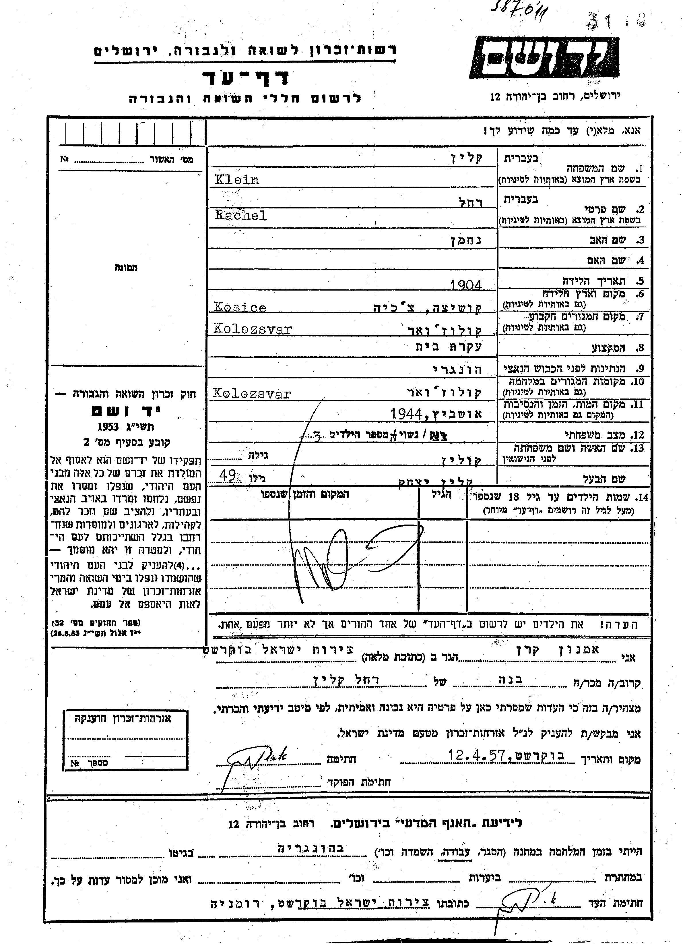 Klein Kalin Rachel 1904 Kolozsvar, Roumanie Feuille de témoignage