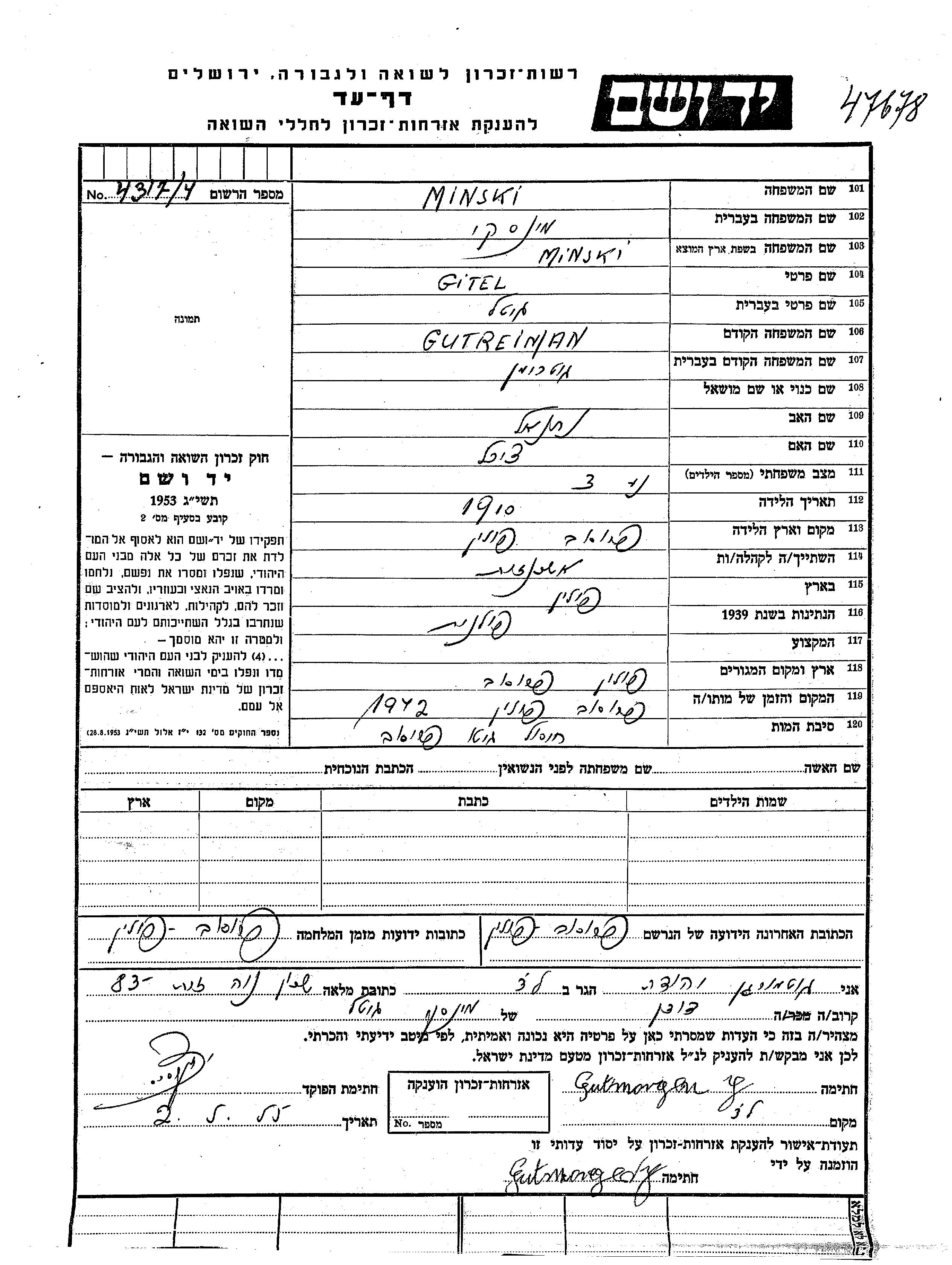 Gitel Minski née Gutreiman est née à Parysow, Pologne en 1910, fille de Natanel et de Tzirel. Elle était Mariée. Avant la seconde guerre mondiale elle vivait à Parysow, Pologne. Pendant la guerre, elle était à Parysow, Pologne.