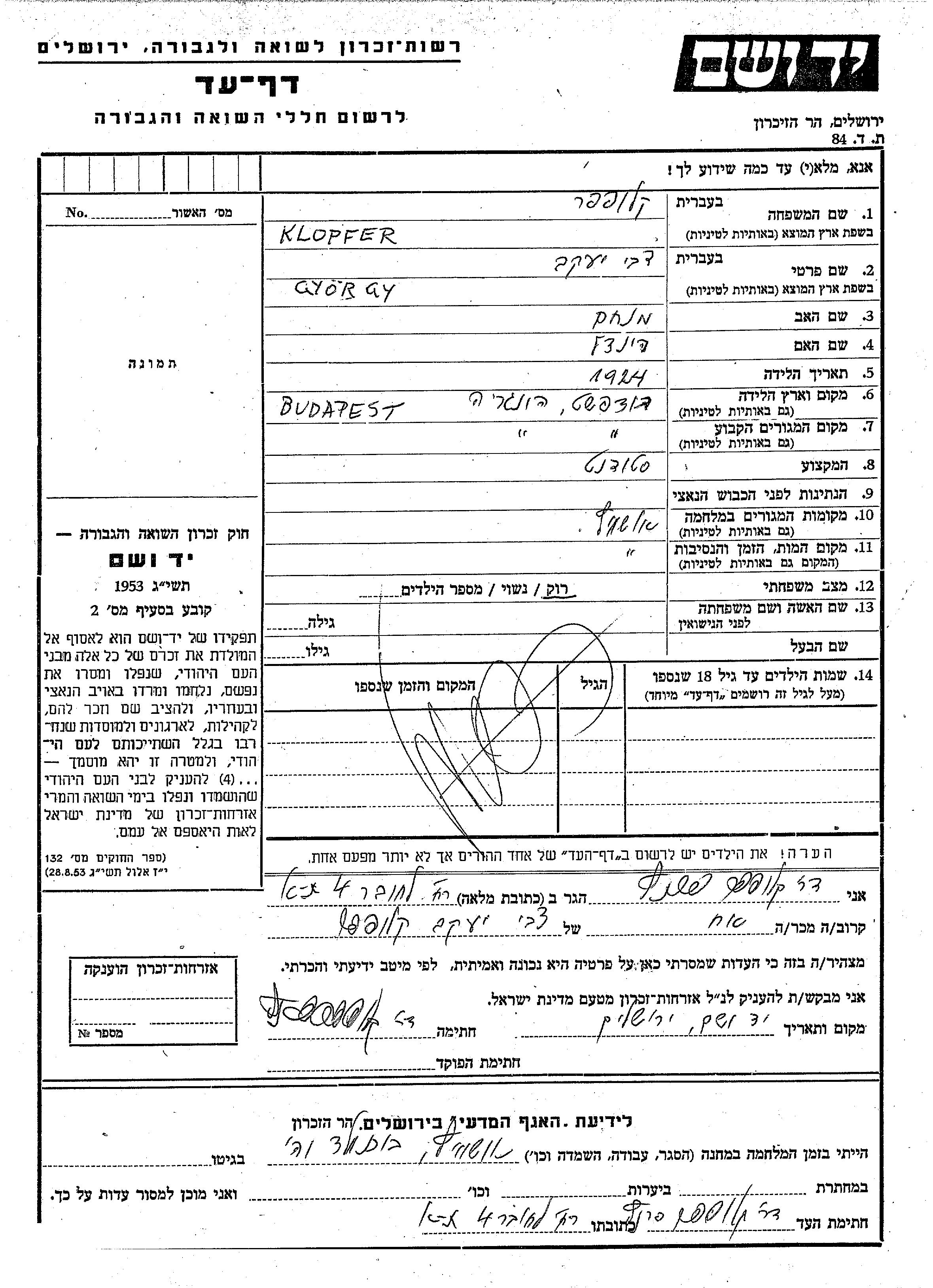 Klopfer Gyorgy Tzvi Yaakov 1924 Budapest, Hongrie Feuille de témoignage