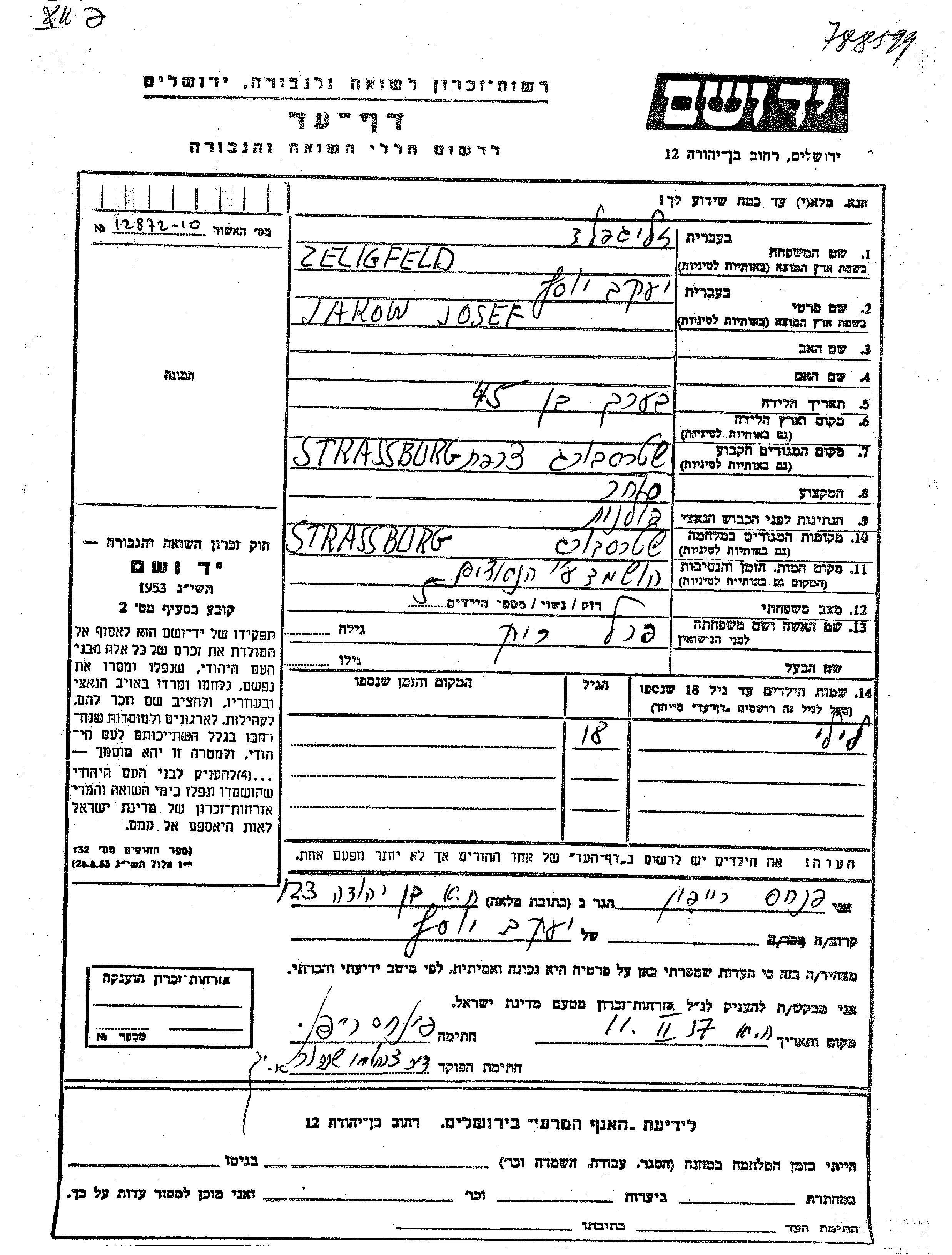 Zeligfeld Jakow Josef Strasbourg, France Feuille de témoignage