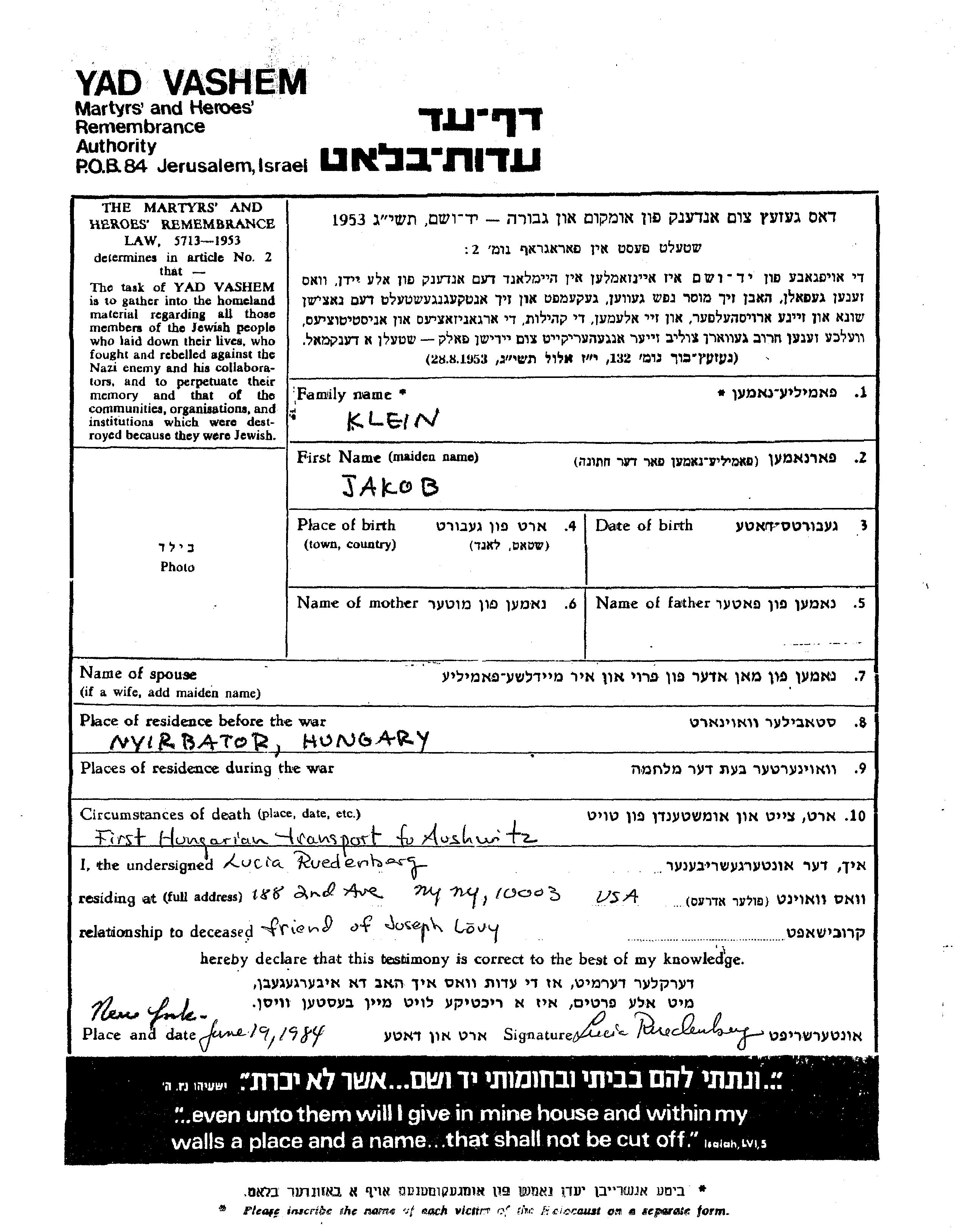 Klein Jakob Nyirbator, Hongrie Feuille de témoignage