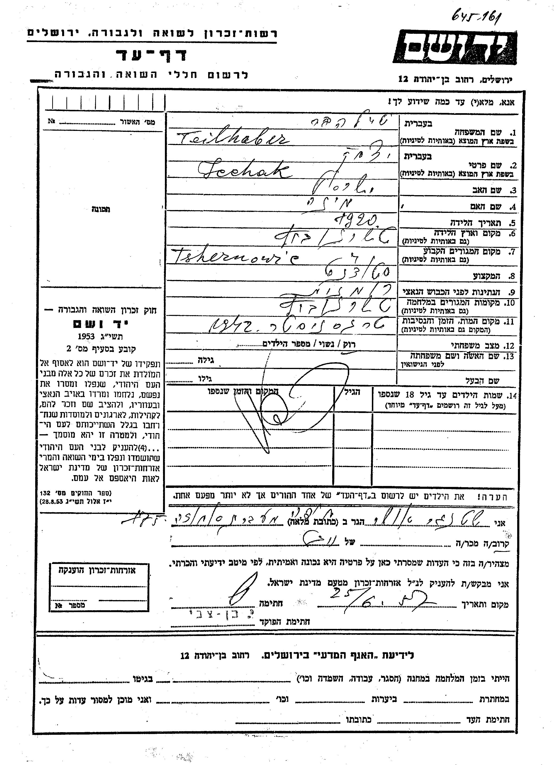 Icchak Teilhaber est né à Cernauti, Roumanie en 1920, fils de Yisrael et de Mina. Il était Étudiant/e et Célibataire. Avant la seconde guerre mondiale il vivait à Cernauti, Roumanie. Au cours de la guerre, il était à Cernauti, Roumanie.