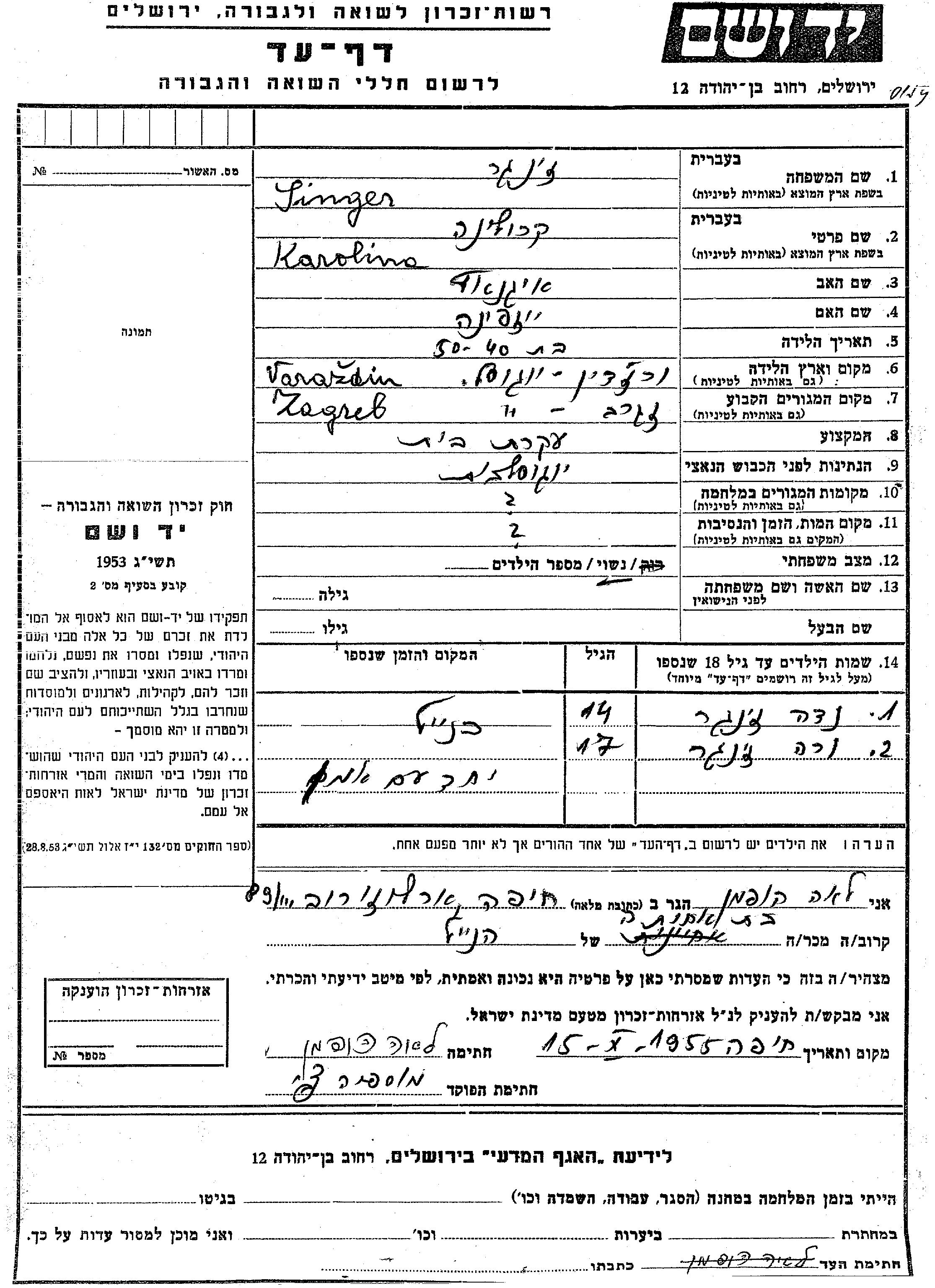 Zinger Karolina Zagreb, Yugoslavie Feuille de témoignage