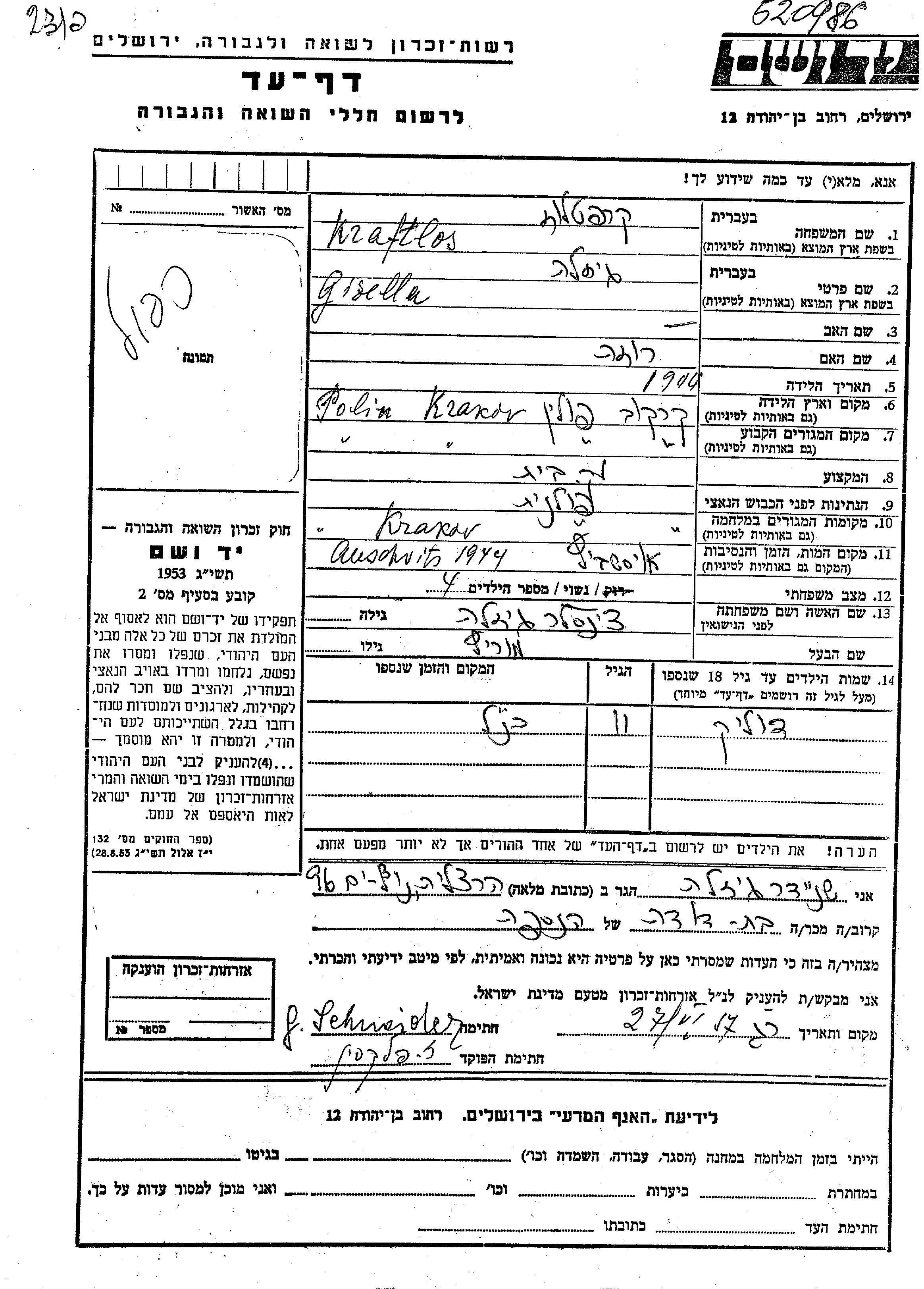 Gisella Kraftlos née Tzinsler est née à Krakow, Pologne en 1900, fille de Roza. Elle était Femme au foyer et Mariée à Moritz. Avant la seconde guerre mondiale elle vivait à Krakow, Pologne. Pendant la guerre, elle était à Krakow, Pologne.