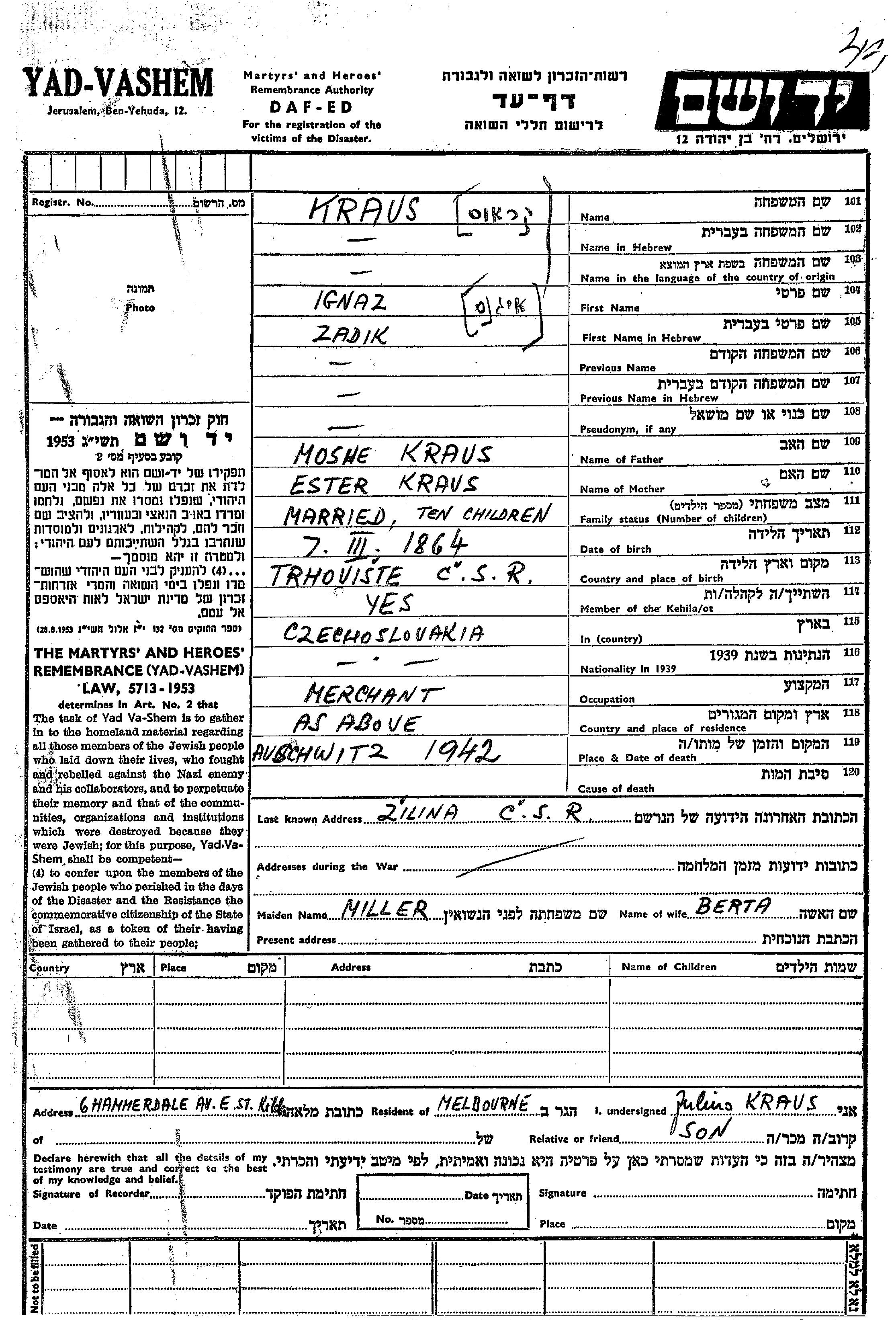 Ignaz Zadik Kraus est né à Trhoviste, Tchécoslovaquie en 1864, fils de Moshe et de Ester. Il était Commerçant/e et Mariée à Berta née Miller. Avant la seconde guerre mondiale il vivait à Trhoviste, Tchécoslovaquie. Au cours de la guerre, il était à Zilina, Tchécoslovaquie.