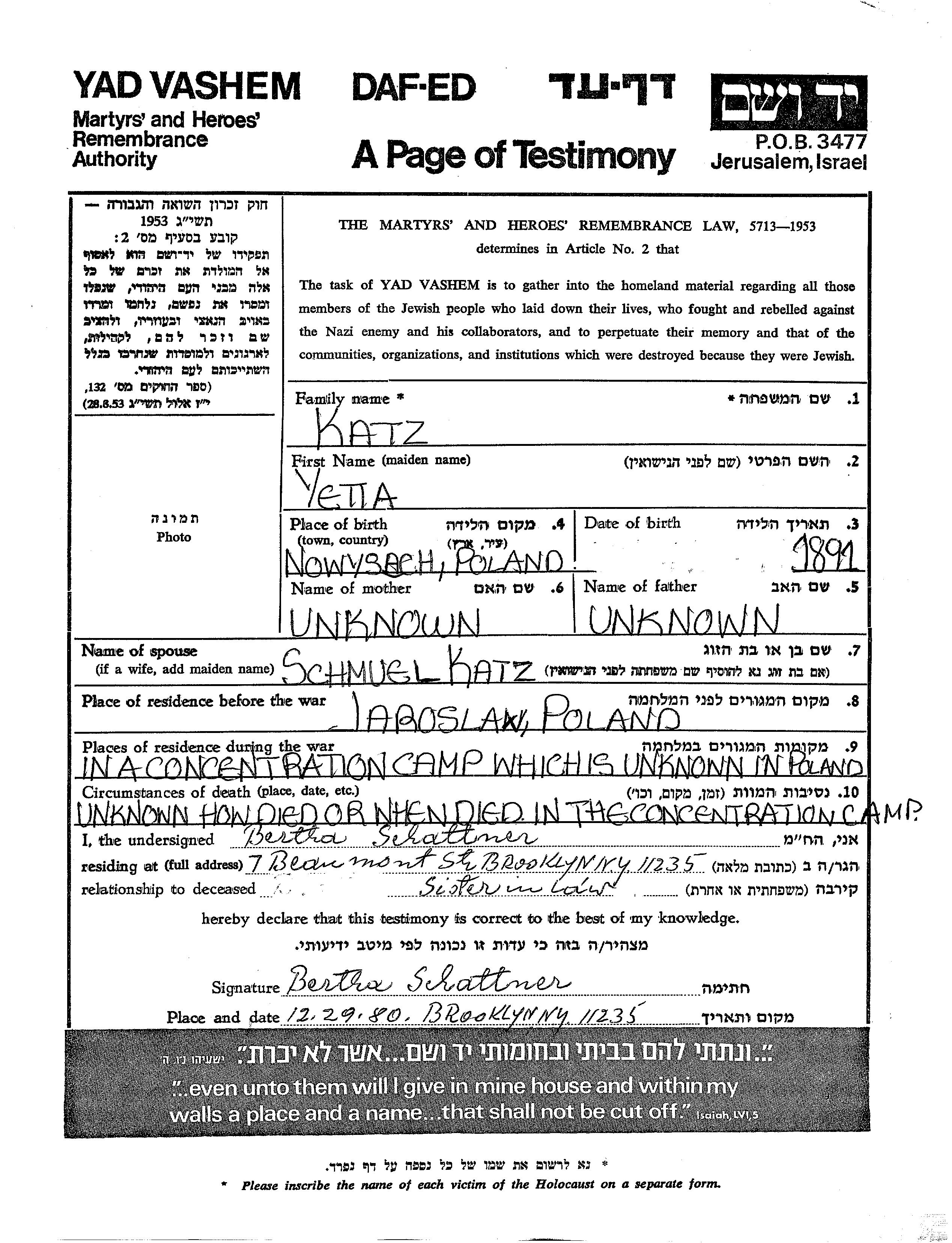 Yetta Katz est née à Nowy Sącz, Pologne en 1891. Elle était Mariée à Schmuel. Avant la seconde guerre mondiale elle vivait à Jaroslaw, Pologne.