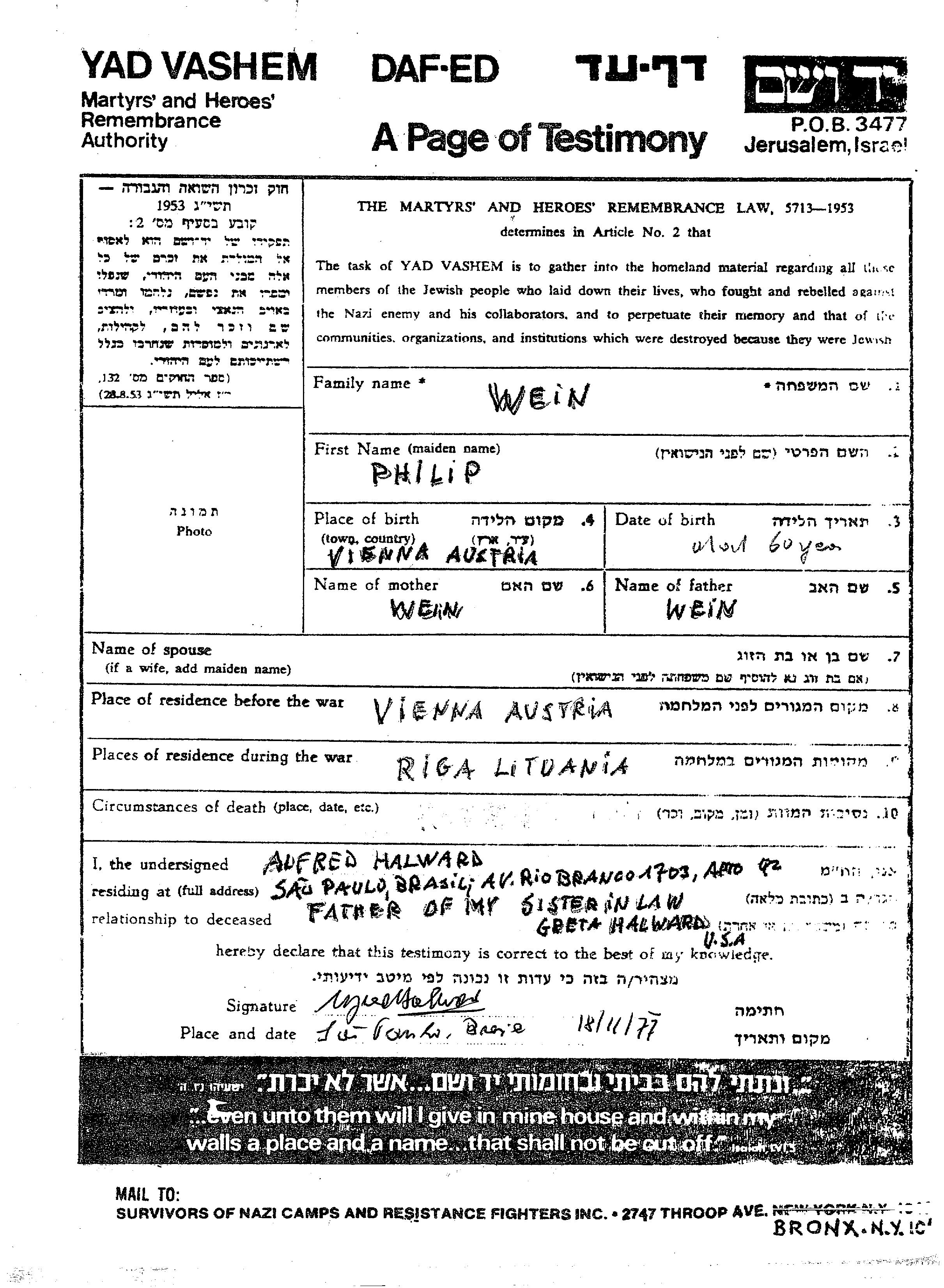 Philip Wein est né à Vienna, Autriche. Avant la seconde guerre mondiale il vivait à Vienna, Autriche. Au cours de la guerre, il était à Riga, Lettonie.