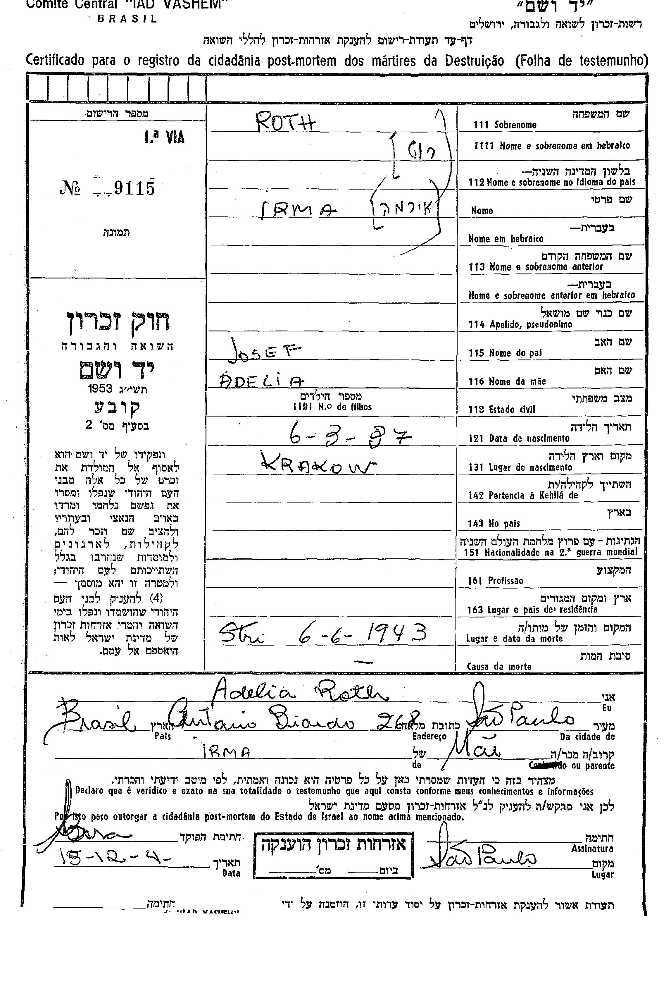 Roth Rut Irma 1937 endroit inconnu, Feuille de témoignage