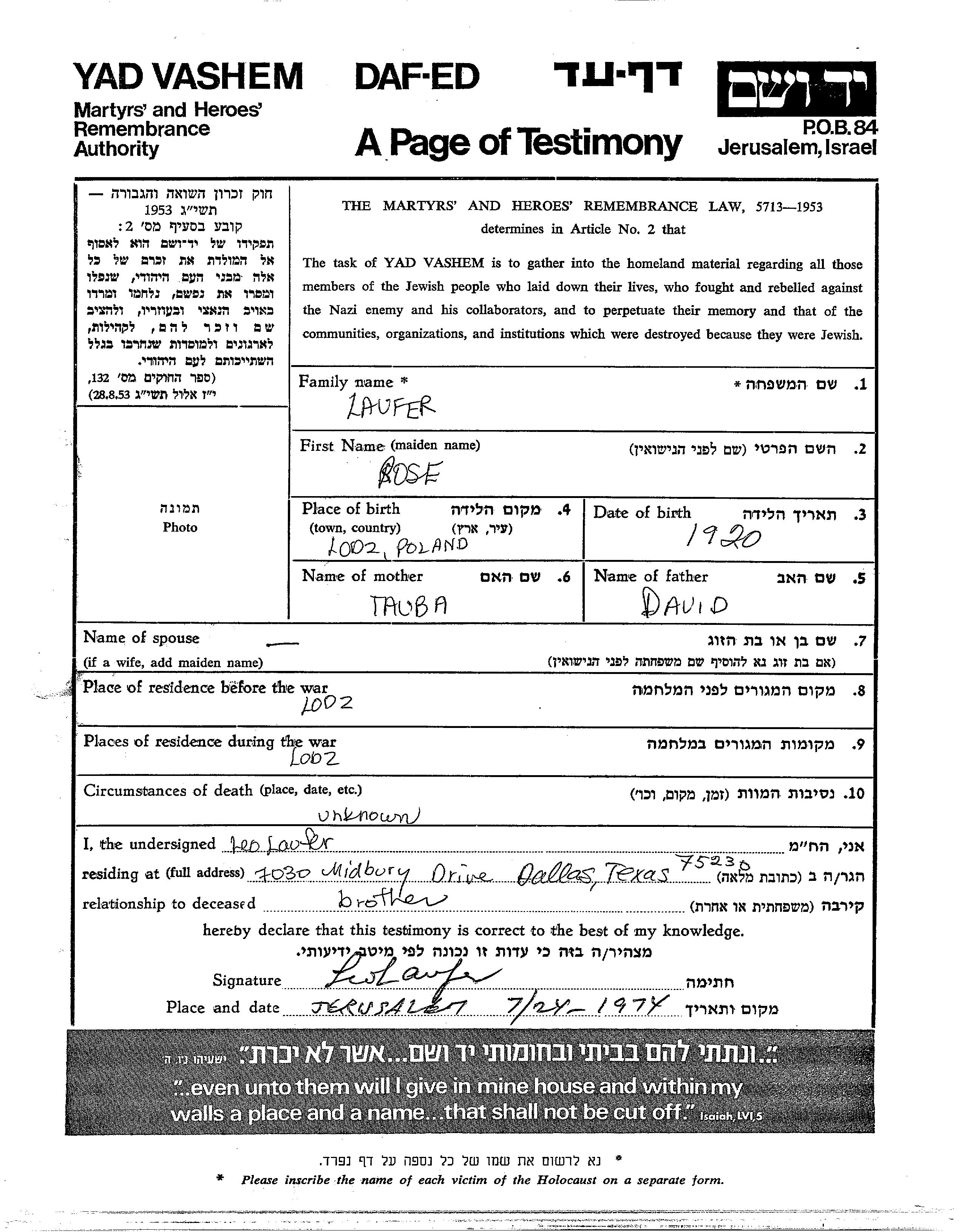 Laufer Rose 1920 Lodz, Pologne Feuille de témoignage