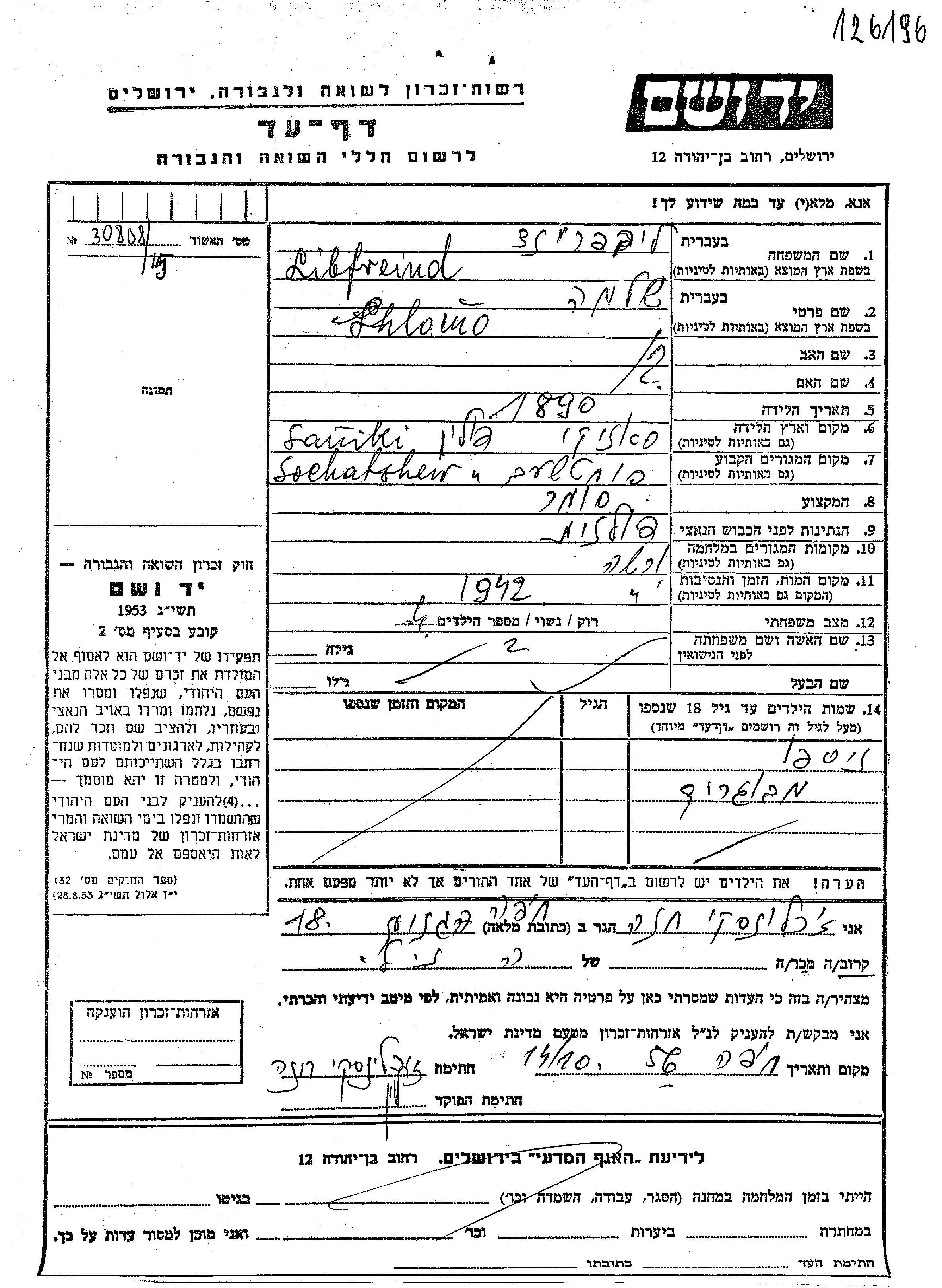 Shlomo Libfreind est né à Saniki, Pologne en 1890. Il était Commerçant/e et Marié. Avant la seconde guerre mondiale il vivait à Sochatchev, Pologne. Au cours de la guerre, il était à Warsaw, Pologne.
