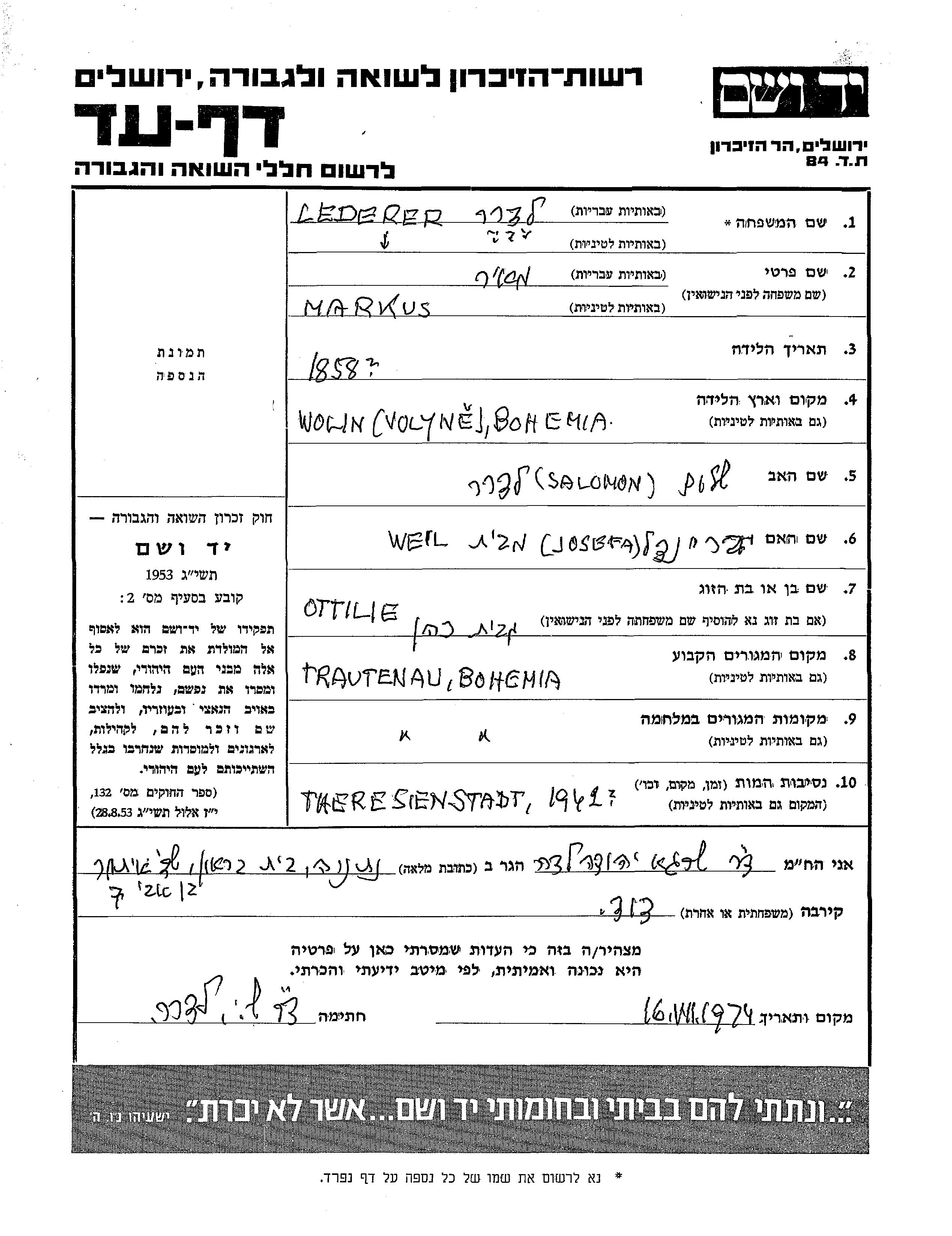 Lederer Meir Markus 1858 Trautenau, Tchécoslovaquie Feuille de témoignage