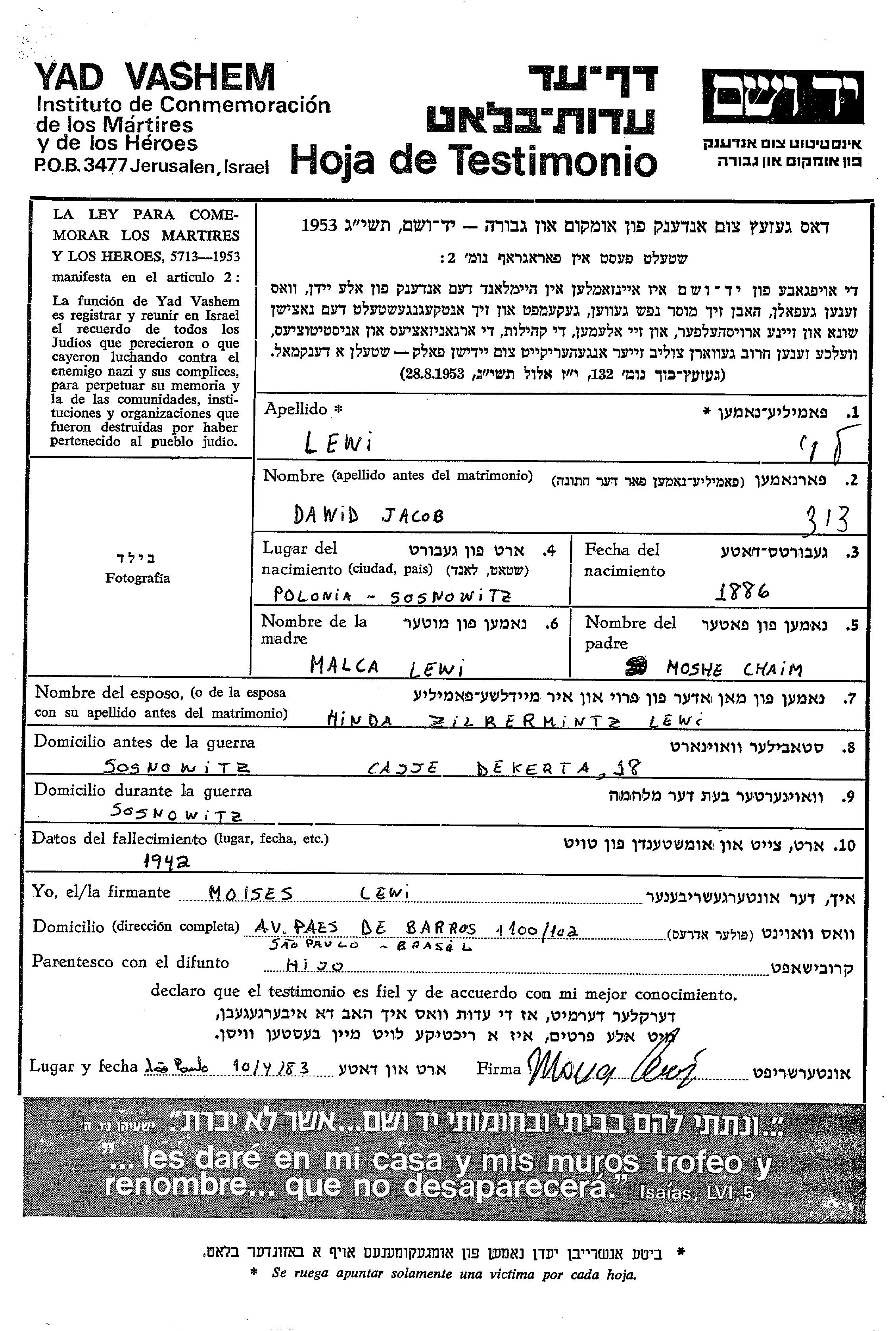 Lewi Dawid Jacob 1886 Sosnowic, Pologne Feuille de témoignage