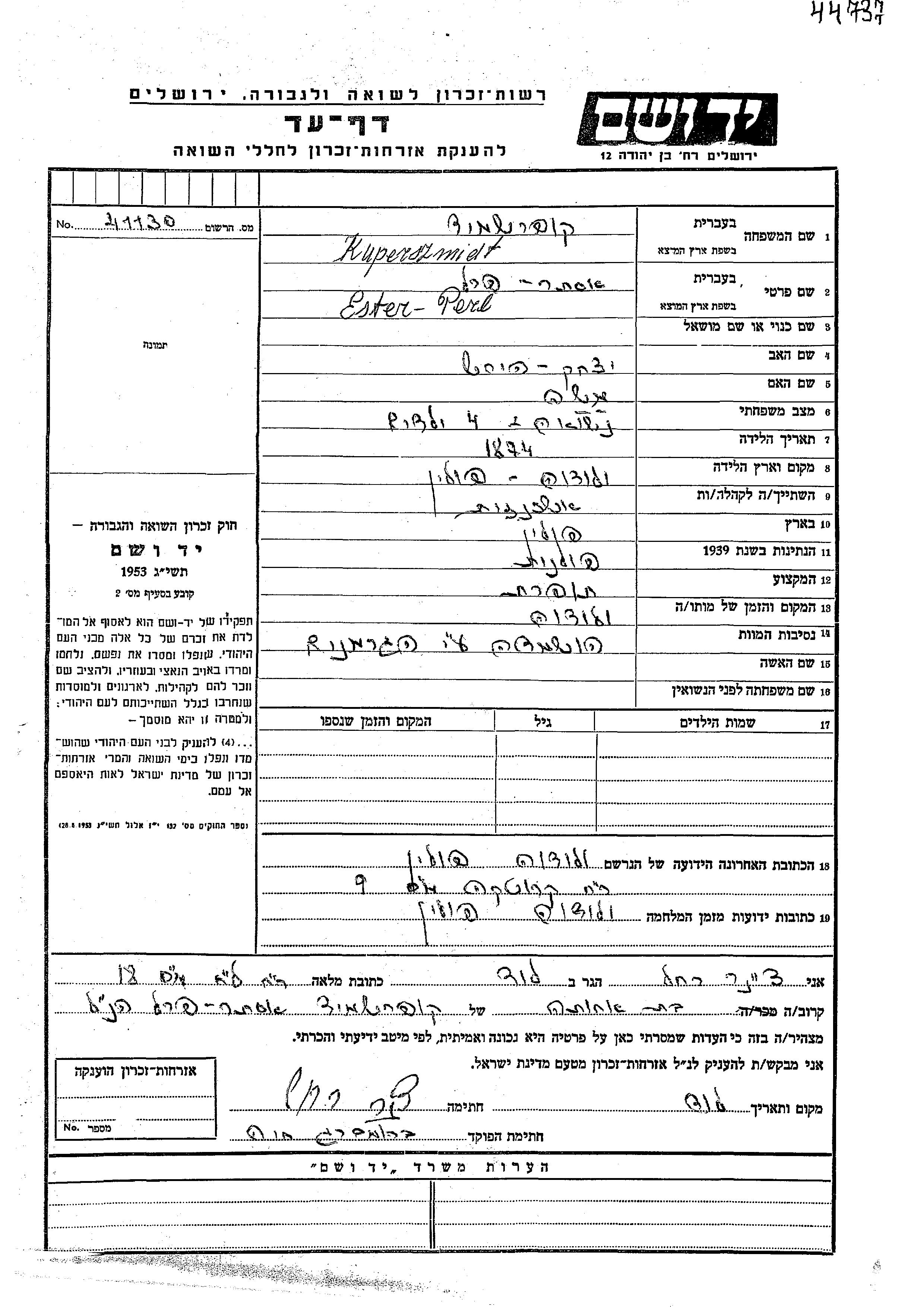 Perl Ester Kuperszmidt est née à Wlodawa, Pologne en 1874, fille de Yitzkhak Hirsh et de Moshe. Elle était Couturière. Avant la seconde guerre mondiale elle vivait à Pologne. Pendant la guerre, elle était à Wlodawa, Pologne.