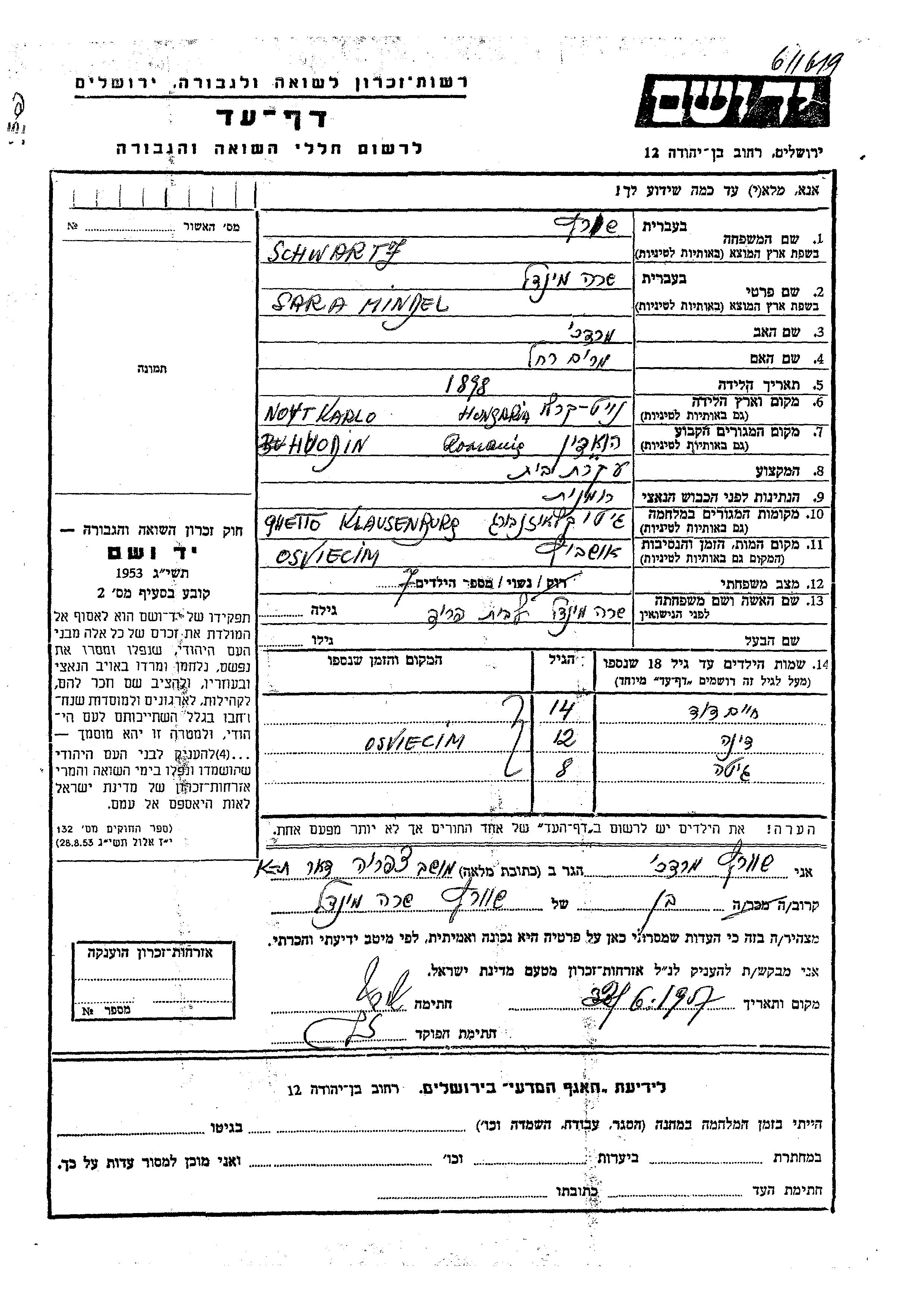 Schwartz Mindl Sara 1898 Huodin, Roumanie Feuille de témoignage